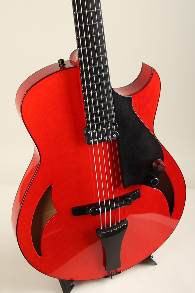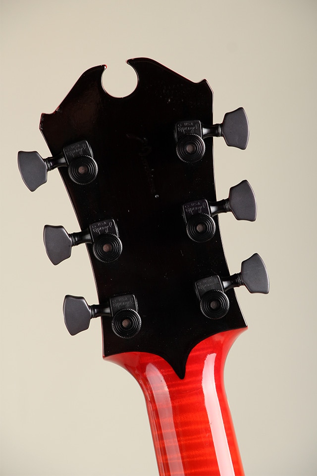 ソリッドスプルーストップに見事なフレイムを有したフィギュアドメイプルサイド&バックにフィギュアドメイプルネック。エボニー指板、エボニーブリッジ、エボニーテイルピースといったマルキオーネ氏が推奨する定番のウッドスペックが採用されています。カラーはマルキオーネ氏のトレードカラーと言えるシースルーレッドが採用、上品な美しさに高級感溢れる洗練されたデザインも魅力といえます。