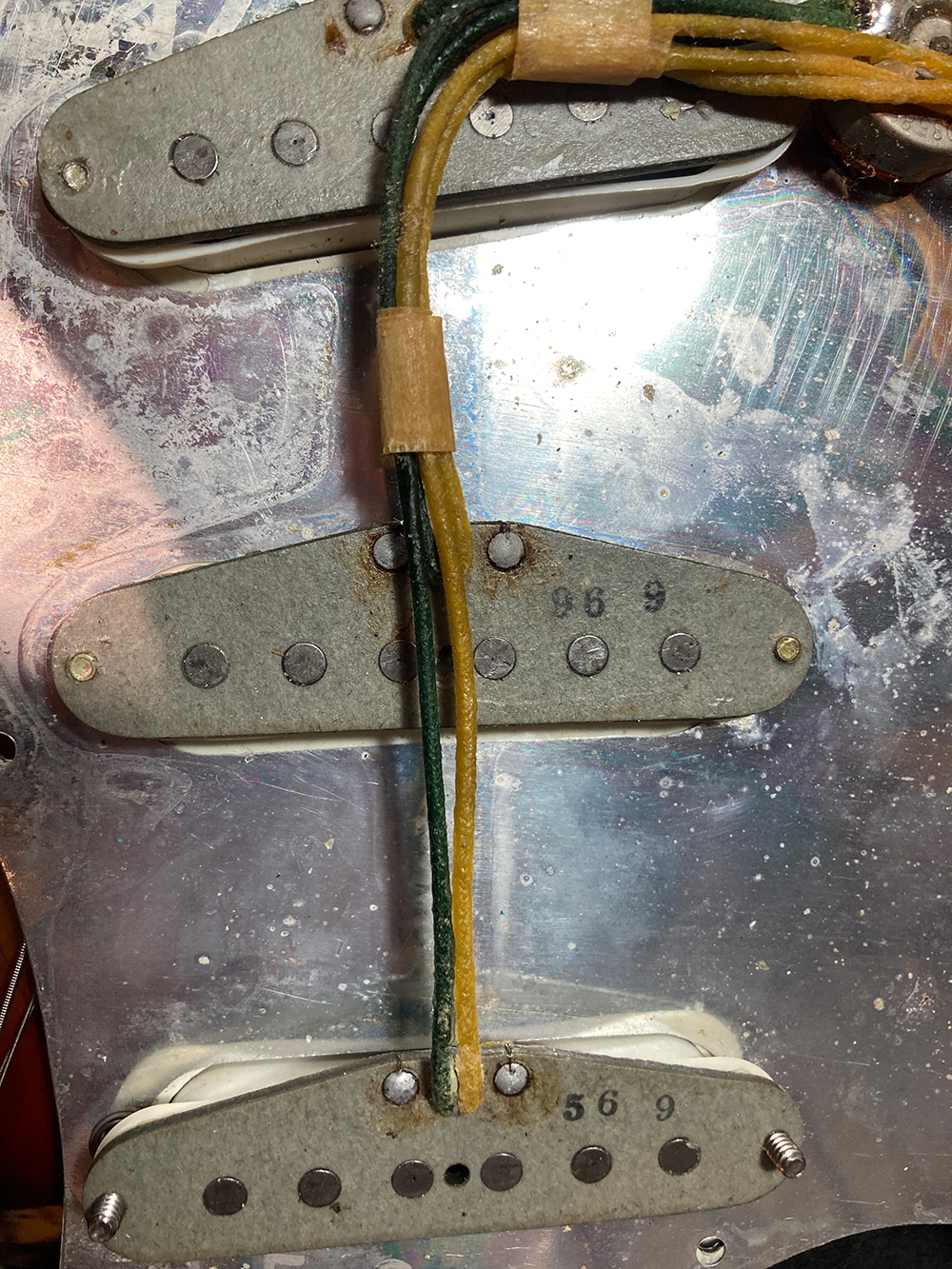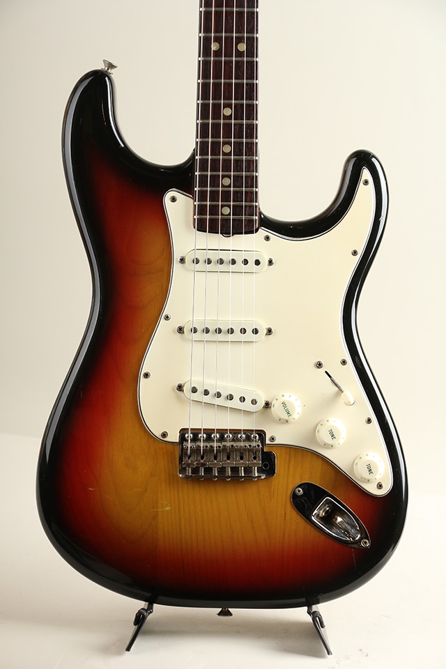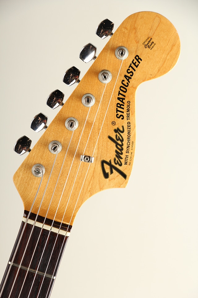 アルダーボディにラウンド貼りローズ指板、”with Synchronized”ヘッドロゴ、69年6週目デイトのグレイボビン・ピックアップ。