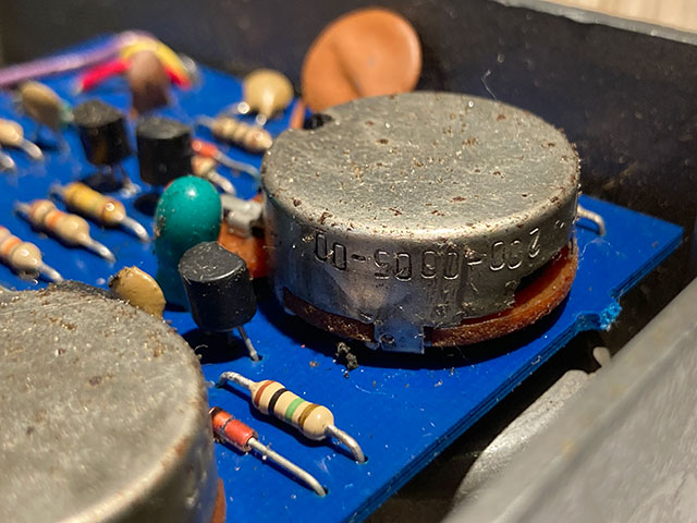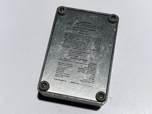 当機はレベル・コントロールノブが"OUTPUT"と表記されているUSA (Keas Electronics製) 初期の個体です。基盤はブルー、オペアンプはRCA製"CA3080E"、トランジスタは2SC1849搭載、シリアルナンバー及びポッドデイトより1978年製と考えられます。ROSS独特の仕様で、回路基板とポットが一体化になっているのも特徴のひとつです。