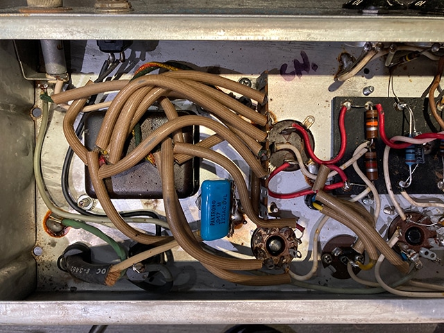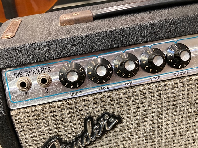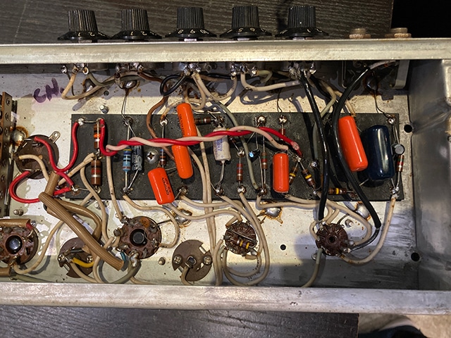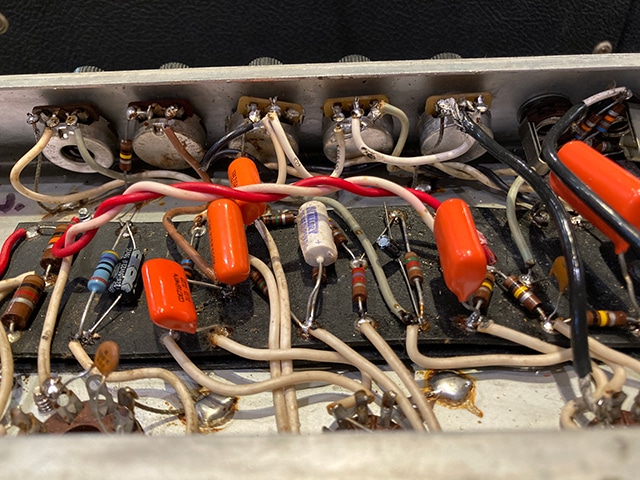 経年からある程度のキズ等は見られます。一部のコンデンサーや抵抗、ポット3つ、真空管は交換。INTENSITYつまみに少しガリ有り。