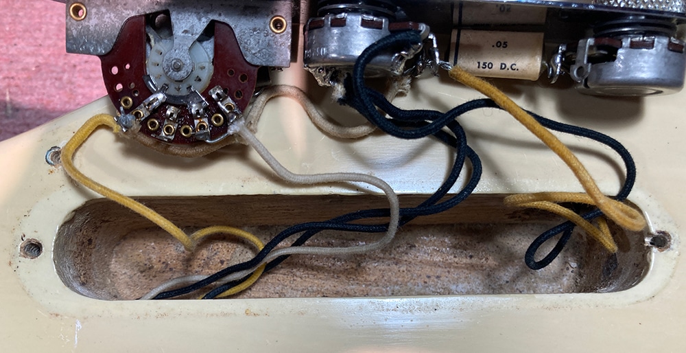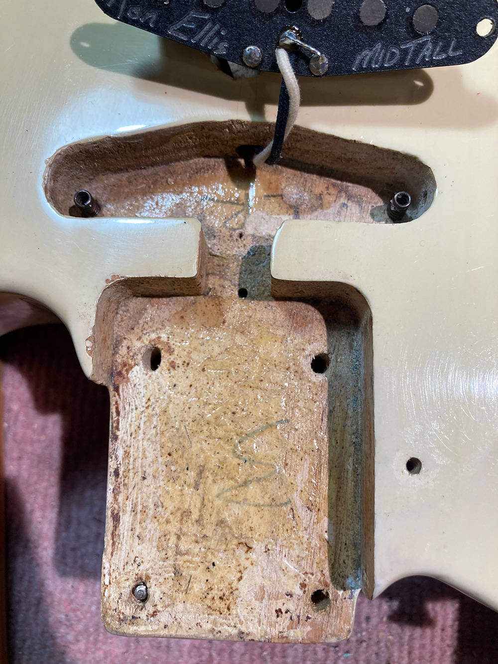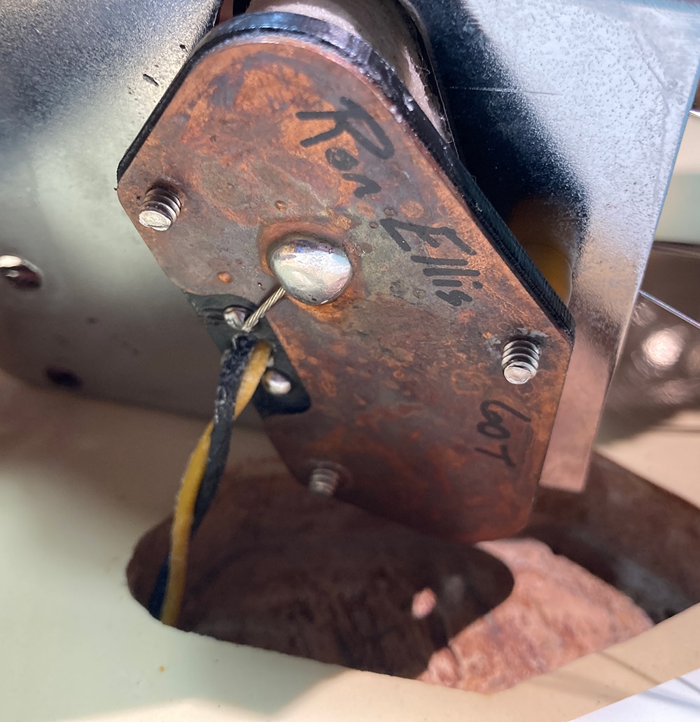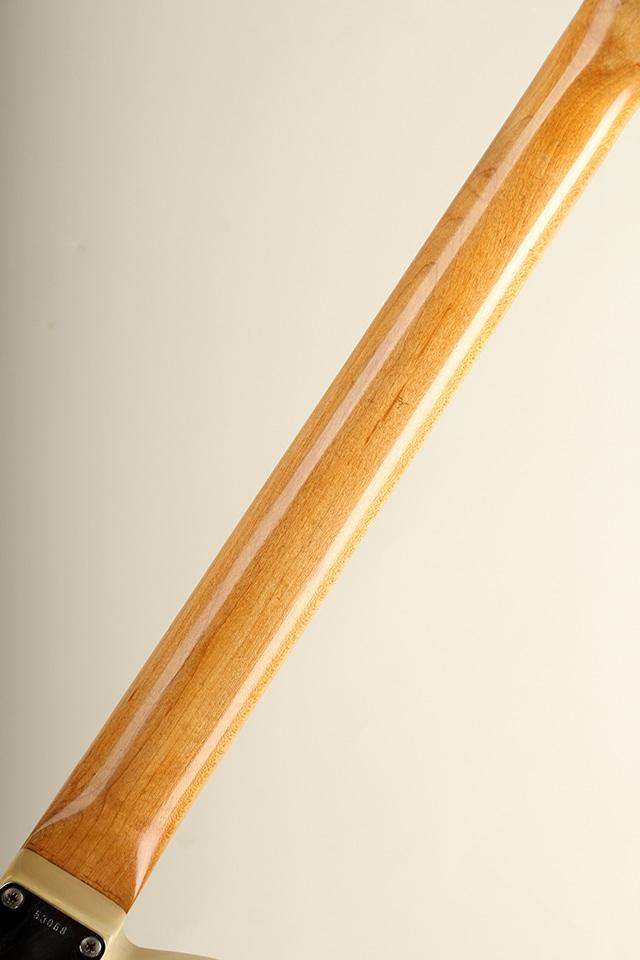 リフィニッシュからも時間が経過しており貫禄のブロンド&ローズの佇まいとなっております。ネックはデイトから62年製と確認でき、ヘッドデカールは貼り直しされネックはオーバーラッカーされております。ボディはキャビティ内のデイトから59年製を確認でき、この年代でのみ見られるトップローディングブリッジが搭載されております。