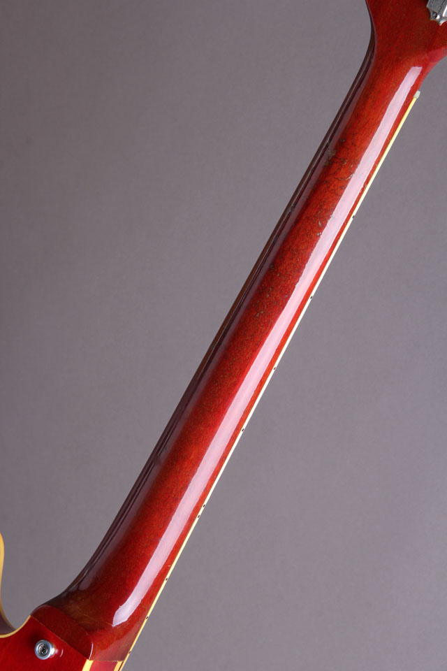 トラピーズ・テイルピース、ナイロンサドル、クロームとニッケルの混在したハードウェア、ふたこぶのクルーソンペグ。ナローネックへと移り変わる1965年ですが当機は65年前半に製作されたと思われ、幅広のナット幅を有するワイドネックとなっております。