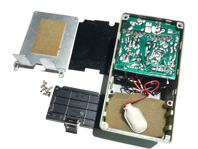 こちらはJRC4558D艶ありオペアンプ搭載、目盛り付コントロール、オリジナルTS808の小振りな筐体から、業界で最もスタンダードな一回り大きい筐体を採用に変更された時期の個体です。"キャラメル" フットSWの面は13°の傾斜にすることでより使いやすいスイッチ操作になっています。こちらは、搭載されているオペアンプ、シリアルNo.、DCジャックの形状より、1981年(後期型)の筐体と考えられます。