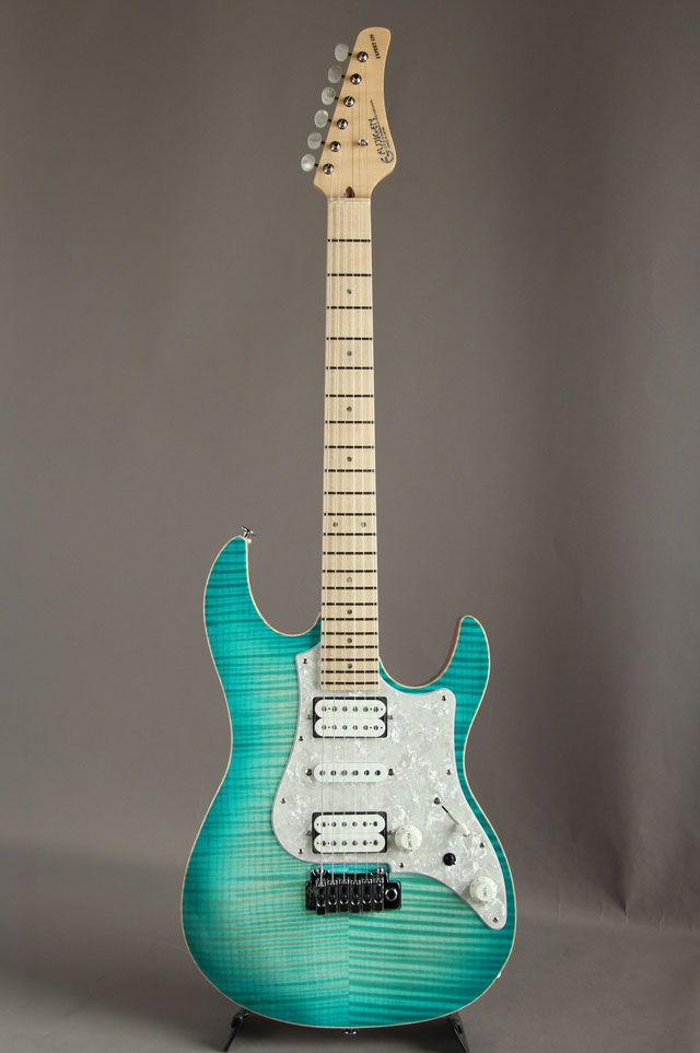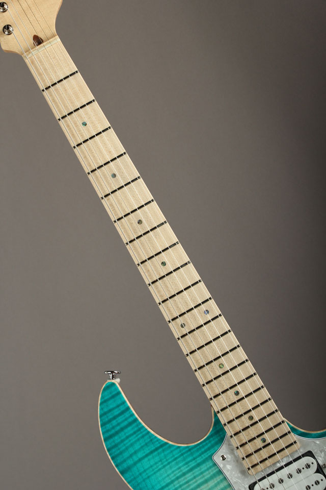 弊店が選定した極上のフレイムメイプルと、特別カラーのAqua-Blue Splash Burst(アクア・ブルー・スプラッシュ・バースト)の美しいコンビネーションが美しいオーダーモデルでございます!!ピックガードにはパールホワイトをチョイス。さりげない輝きが、全体を美しく彩ります。