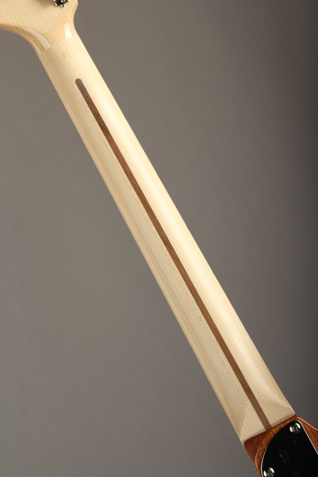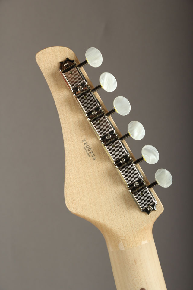 ネック材は反りなどの狂いが少ないメイプル材、選りすぐられた”柾目”を採用。自社独自の乾燥設備・乾燥工程で狂いだしを行い、強度を上げ、ギターネックの素材として最適な状態にした後、加工されています。もちろん、サークルフレッティングシステム装備です。