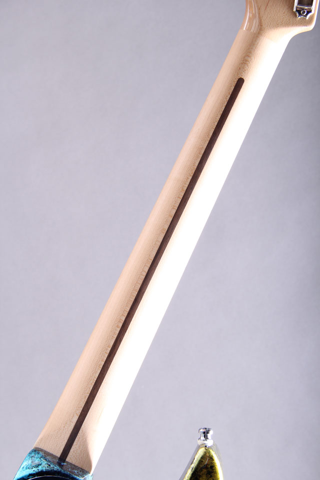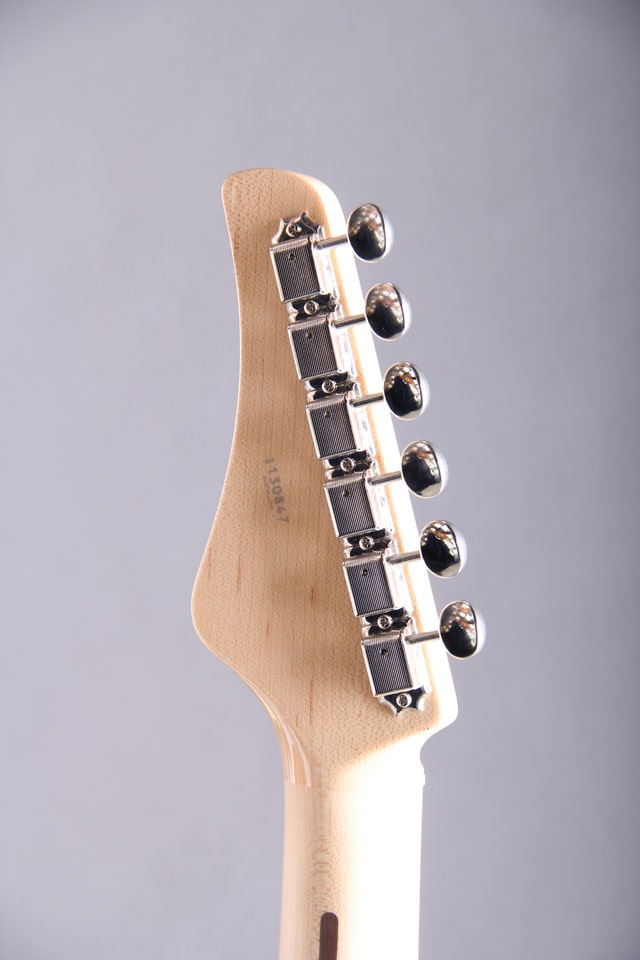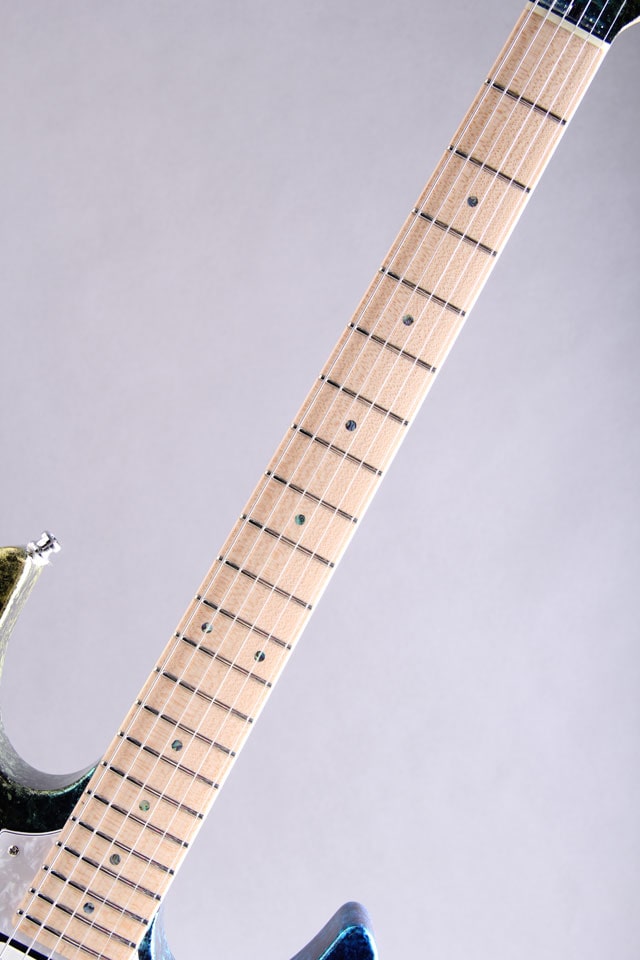 ネック材のメイプル材には反りなどの狂いが少ない、選りすぐられた”柾目”を採用。自社独自の乾燥設備・乾燥工程で狂いだしを行い、強度を上げ、ギターネックの素材として最適な状態にした後、加工されています。もちろん、サークルフレッティングシステム装備です。