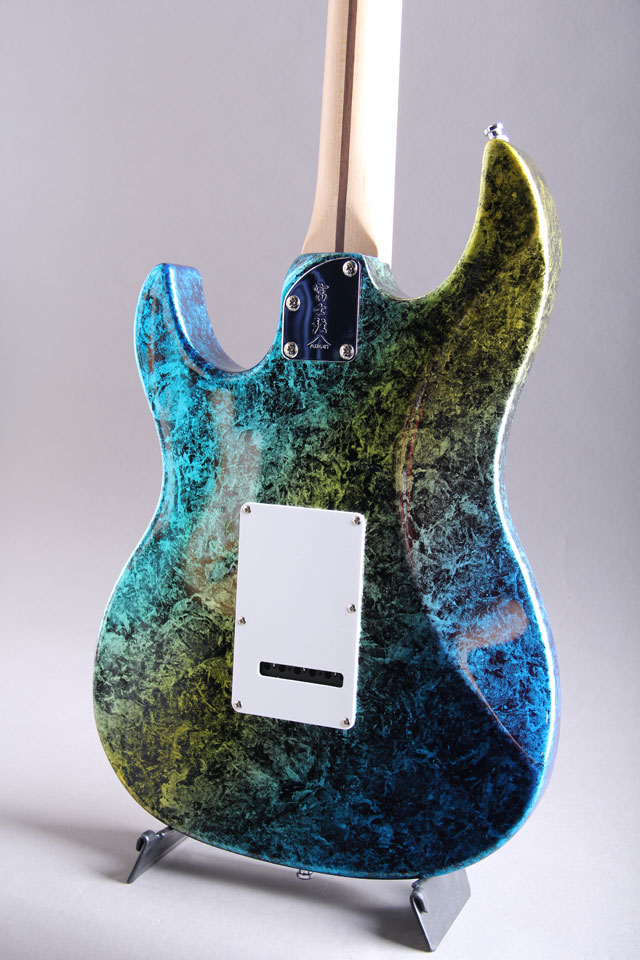 今回は...キラキラと輝く透き通ったエメラルドブルーの海辺と、黄金色の太陽の光が反射した目映い程の真っ白な砂浜を思わせる美しいカラーオーダー。パールホワイトのピックガードと、統一された真っ白なパーツ、海岸を繋ぐ浜辺が思い浮かぶメイプル指板が、その美しい仕上がりを引き立たせております。