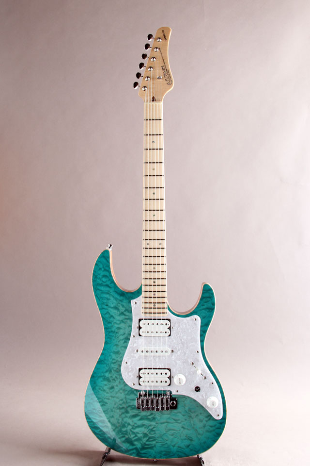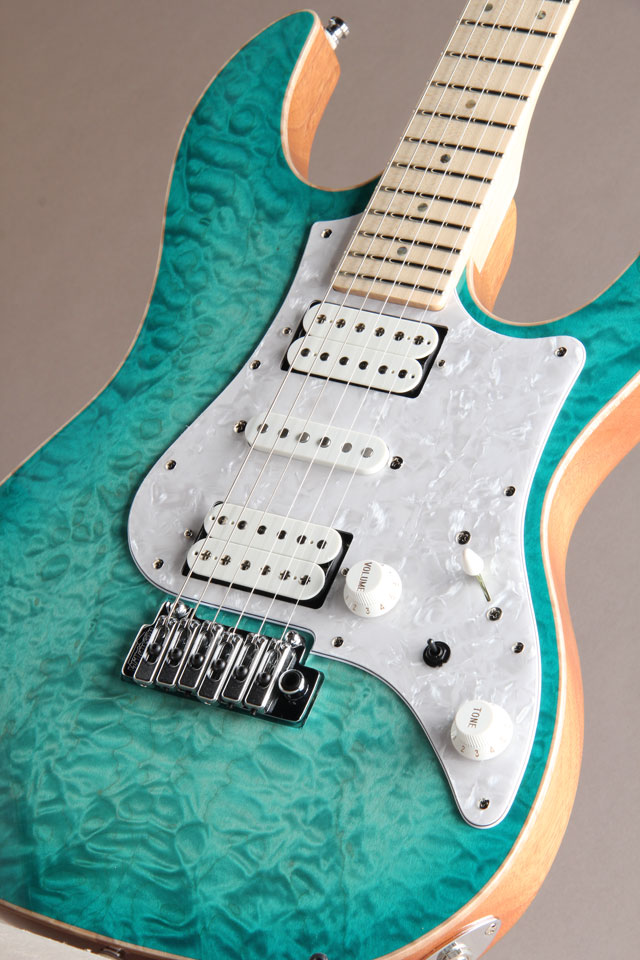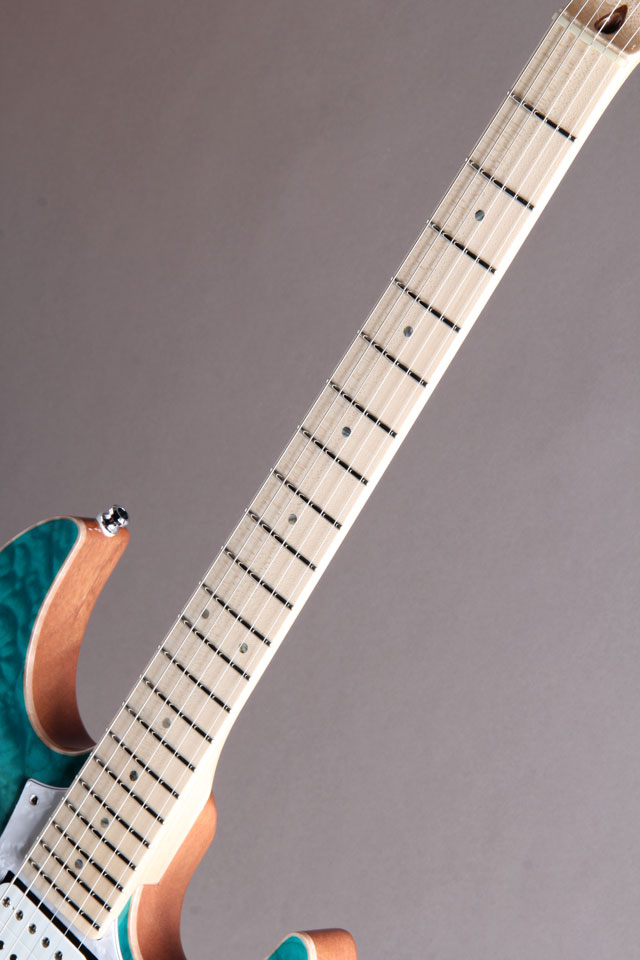 当店STAFFが選定した極上のキルトメイプルと、特別カラーのAqua-Blue Splash Burst(アクア・ブルー・スプラッシュ・バースト)のコンビネーションによって生み出されるその姿。こちらのオーダーモデルは【~My Favorite Marine Blue~】と題し、太陽の光を受けて美しく煌びやかに輝く海の色をイメージした1本となっております。前回のオーダー時非常にご好評を頂き、特別に2本目をオーダー。今回も素晴らしい杢目が目を惹く唯一無垢の仕上がりでございます。