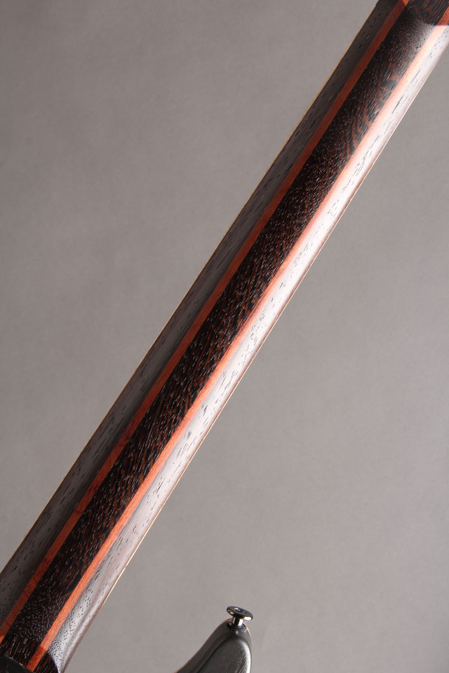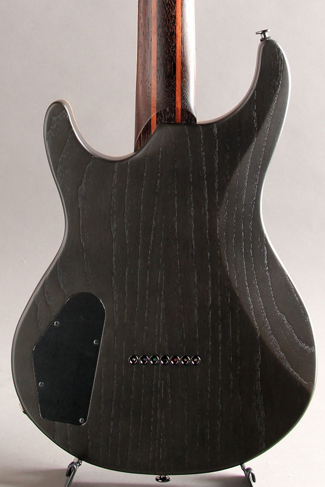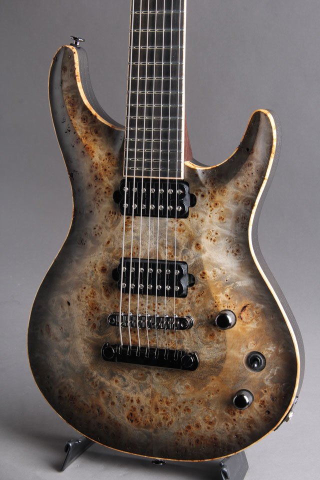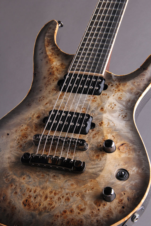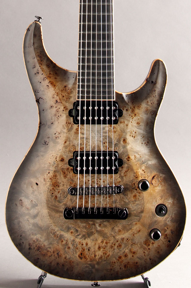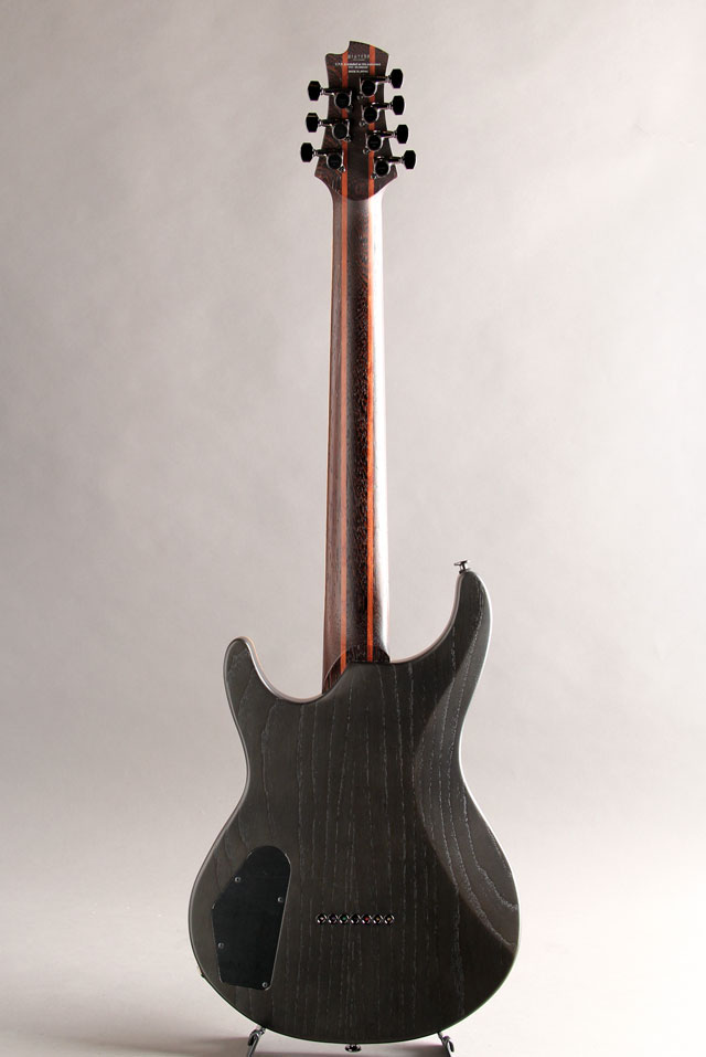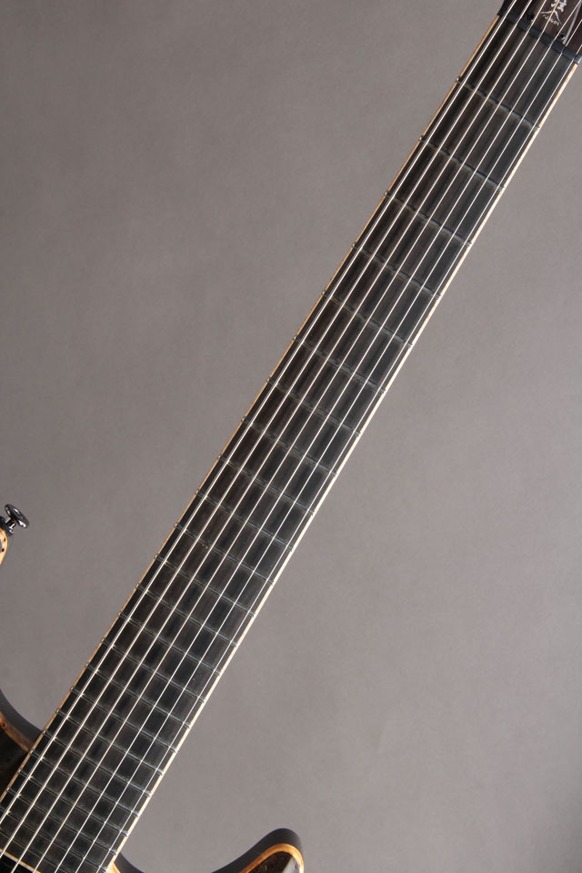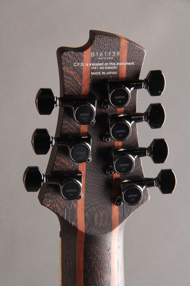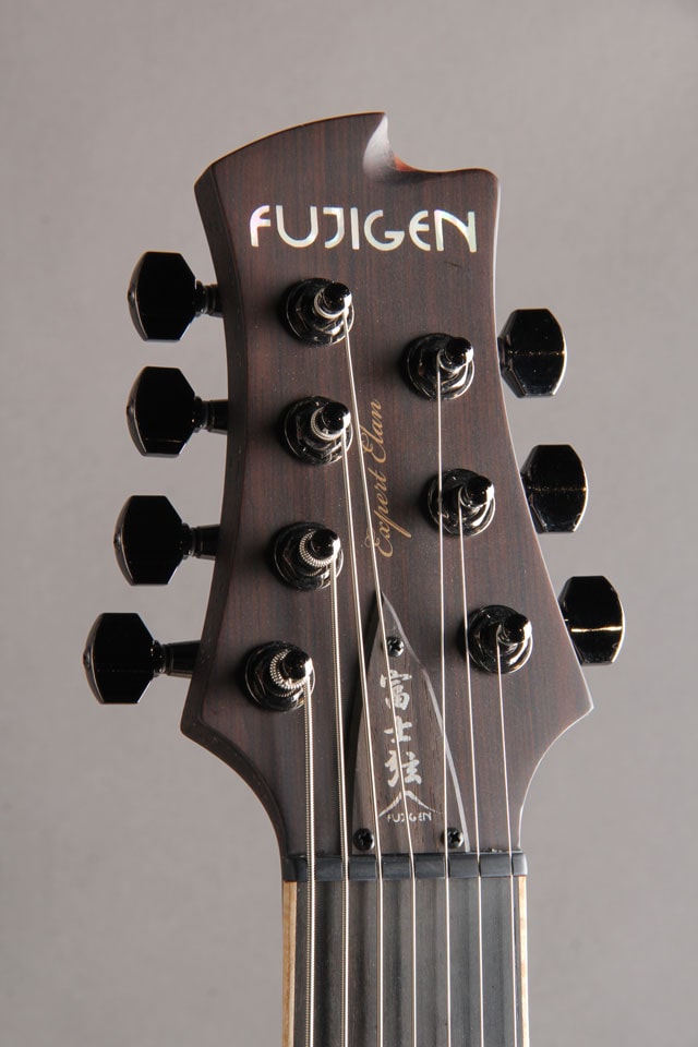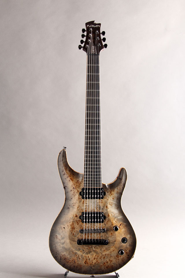 今回は特別なメモリアルオーダーとなります為、通常モデルでは到底使われることの無い特別な木材を贅沢に採用させていただきました。マットフィニッシュにて仕上げられた落ち着きのある質感にポプラバールの荒々しい杢目とSaturn Faded Smoke(サターン・フェイデット・スモーク)と名付けた弊店オリジナルカラーがコラボレート。威圧感のある重厚なルックスも魅力ですが、このギターの良さは見た目だけではございません!ボディバックには2Pアッシュを用いて、通常のELANに比べクリーントーンではより明瞭に、ドライブサウンドではよりコード感に輪郭のあるサウンドとなります。指板材には希少材になりつつあるエボニー材を、ネックにはより強度の高いウェンジ/ブビンガ5Pを採用しています。 ヘッドストックベニヤ及びトラスロッドカバーにはハカランダ材を採用、また、選りすぐりの美しい杢目のフレイムメイプル・ネックバインディングが全体を引き締めオーラを放ち高級感を漂わせます。 ピックアップにはハイエンドピックアップメーカーの中でも随一の人気を誇るBare Knukle製 "AFTERMATH"をボディにダイレクトマウント。高出力ながら高域が埋もれることも無い明瞭なトーンが特徴で低音弦でのリフもタイトに抜けよく出力してくれます。通常のELANではエスカッション・マウントですので、この仕様を採用しているのはこの1本のみ!という点も魅力の1つです! 7弦の輪郭もはっきりしており、素早い立ち上がりとクリアなサウンドを併せ持っておりますが、決して硬くなりすぎず非常に音楽的なイメージを与えてくれるサウンド。プレーヤーの感性を刺激するタッチレスポンスにサークルフレッティングシステムによるピッチの安定性など高い技術を有するFUJIGENギターの伝統と彼らのストイックな探究心を存分にご体感いただけます。 もともとの仕様としてFJTPテイルピースを搭載しており、各弦裏通しと表通しを選ぶことができますので、プレーヤーの好みに合わせサウンドやテンション感を細かく調整することが可能。 工場出荷時は1音下げ、ヘヴィゲージセッティングとなっていますが通常のレギュラーセッティングでお使い頂いても、全く問題ございません。