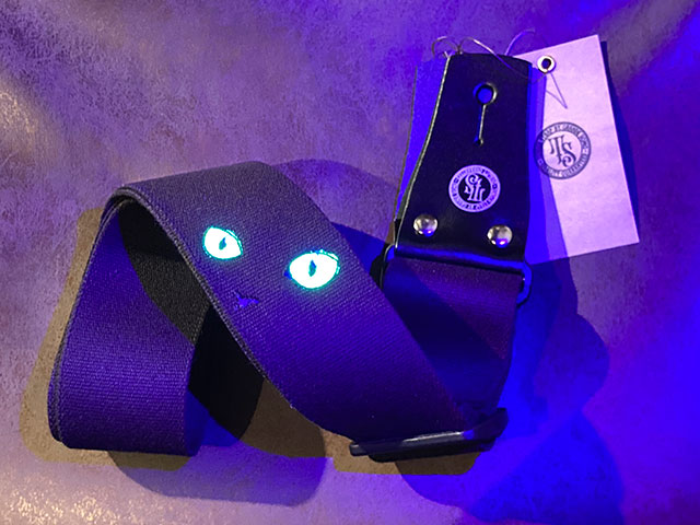 三木楽器限定モデル!暗闇でお目々が光る!夜行性ねこストラップ!ブラックライトを浴びると更に光るので、ステージ上できりりと光ります!!