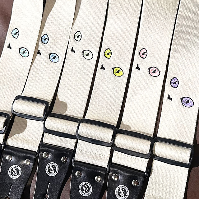 ギター・ベースストラップ専門店 Grande uomoが監修するカジュアルラインストラップブランドTENDER STRAP! プレゼントに、自分へのご褒美に!きらっと光る猫の目が可愛いストラップ TS2-AC ねこ。 人気のこちらのモデルの、★三木楽器限定★ネオンキャットシリーズ!!白ねこバーション! 蓄光の糸を使ってお目々がデザインされていますので、暗いところで光ります。 ブラックライトを浴びると更に光るので、ステージ上できりりと光ります!! ストラップ本体の素材には柔らかくて肩への馴染みの良いアクリル製を使用し、ベルト調整のバックル部分にはギターを傷つけにくいプラスティックパーツのものを採用しております。 また、ストラップピン取り付け部分には、しっかりとした本革を使う事により革がへたりにくくなっております。 ストラップの幅(肩にあたる部分) 5cm ストラップの調整可能な長さ【ストラップピンの取付穴の間の長さ】 約85cmから140cmまで調整可能 ストラップピンの取り付け穴のサイズ 8mm ※画像はサンプルです。ハンドメイド製品のため、1つ1つ刺繍やレザーの風合いが異なる場合がございます。予めご了承くださいませ。