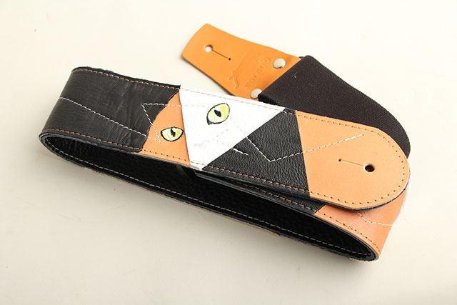 ねこの目と刺繍をアレンジして何ともかわいい三毛猫が描かれた世界に1つしかないデザインのパッチワークストラップ。全体的に三毛猫のイメージでパッチワークデザインが施されており、CHERIE ANNEならではの天才的なアイディアが詰まった1本!剣先のレザー部分に隠れねこ発見!こんな遊び心が満載!