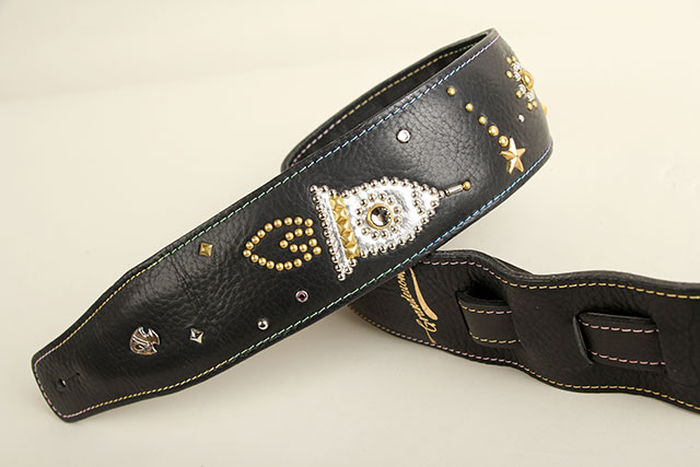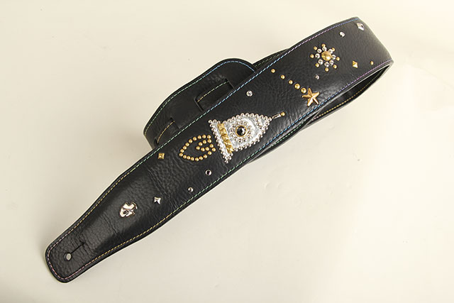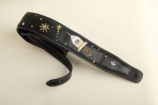 インレイ技法を用いたロケットや惑星が入った可愛い刺繍入りのレザーストラップです。国産本革の栃木レザーに手作業で華やかなロケットデザインのスタッズが施され、ラインストーンで仕上げられた特別仕様の1本です!レザーの上に1粒1粒繊細にスタッズが打ち込まれ、遊び心と職人魂が詰まった愛の深い1本に仕上がっています。