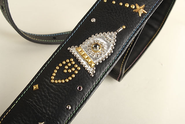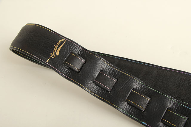 淡い色合いのレインボーステッチで、華やかさもありながら"派手さ"を感じさせない上品さも兼ね備えています。裏側にブラックのDeer革を貼った豪華な仕様で、クッションが入っているので演奏時の肩への負担も軽減され、デザインのみならず、使い心地まで抜かりなくこだわった1本です。