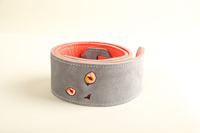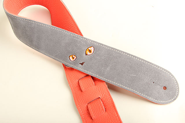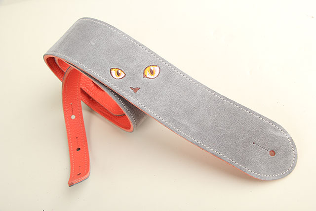 こちらは三木楽器梅田店カスタムオーダーモデル!表にはG-Standardシリーズの極上イタリアンスエードのグレーカラーを、裏には柔らかな質感のコーラルレッドカラーのシュリンクレザー採用し、可愛いトパーズカラーのお目々刺繍が入ったもふもふねこのイメージで仕上げられたレザーストラップ!表裏どちらも上質な本革を採用していますので、リバーシブルでの使用も可能。(ねこちゃんが可愛いすぎるので隠れるのが寂しいですが...)