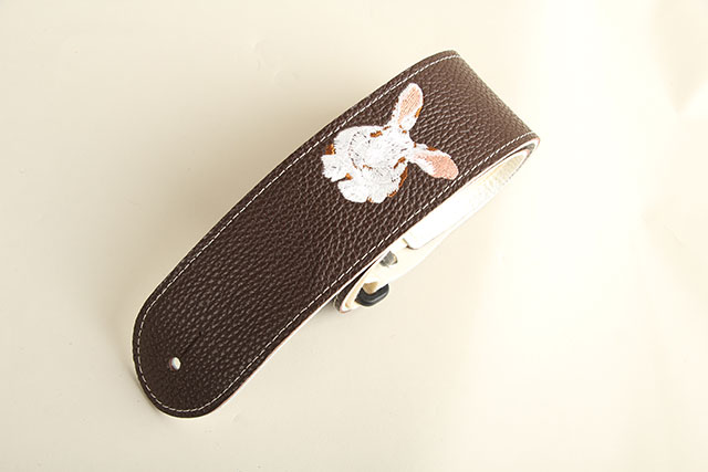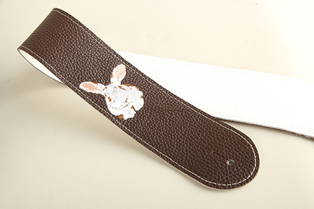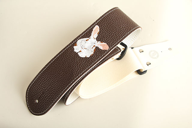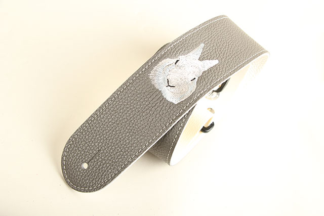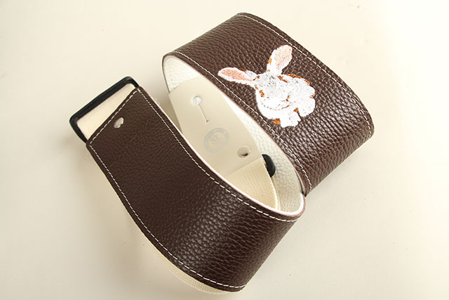 こちらのモデルは井聖一さんの愛ウサギ、ポムちゃんをモデルにデザインされた刺繍がワンポイントになっていてとても可愛いデザインが魅力ですが、レザー部分には国産シュリンクレザーを採用し柔らかな質感を実現。パーツには楽器に傷が付きにくいよう配慮されていますので、アコギユーザーの方にもおすすめです。