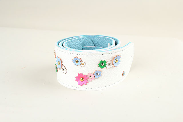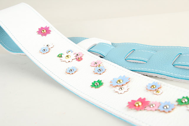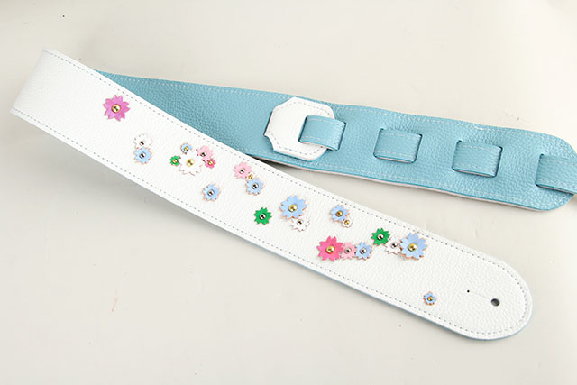 ふわっと舞う桜の花は、すべて手作業で染色したレザーを桜の形にくり抜き、その桜を彩り豊かに配置して中央にスタッズを。これまでに見たことのないほどに遊び心もあり華やかな仕上がりになりました。