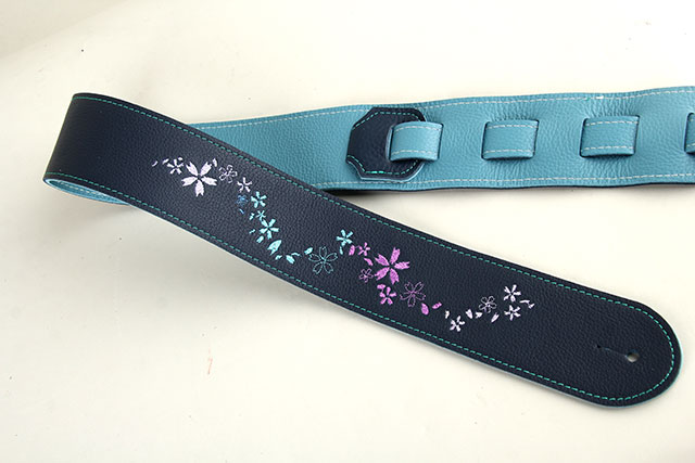 表はネイビー、裏にライトブルーカラーのレザーを採用し、ステッチカラーは水面をイメージする淡いグリーンを差し色に、裏側はホワイトとなっています。月明かりに輝らされた桜の花びらが舞い散る様子が水面に映る。そんな情景が儚く表現されているような、なんとも美しいデザインに仕上がっています。