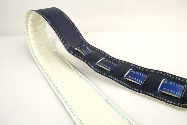 楽器を華やかに彩る、CS G-premium Blue Fadeは手染めによって深みのあるブルーグラデーションに染色され、落ち着いた雰囲気のデザインに仕上げられています。裏側には心地よい柔らかさが魅力の特別なレザーG-Premium Deer (鹿革) を採用。もちもちとした手触りに加え、インナークッションも入った至れり尽くせりな豪華仕様となっており、肩への負担に不安がある方にもおすすめの1本です。ダブルステッチ仕様で、表はベージュ、裏はライトブルーと、実はちょっとレアな仕様です。