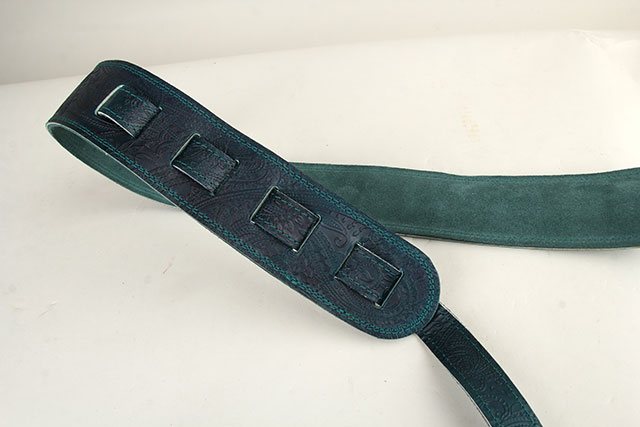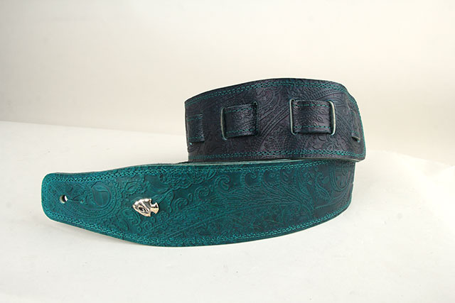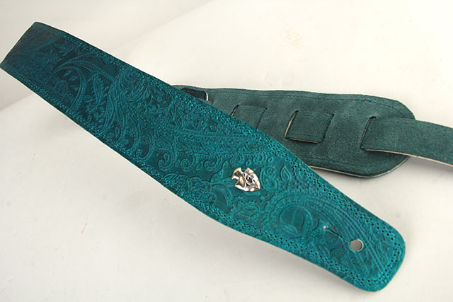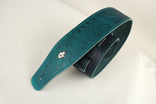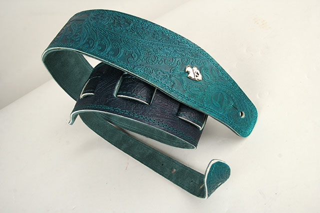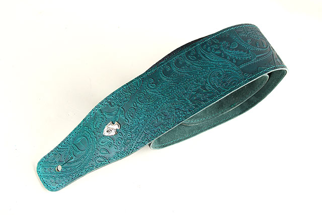 全て手作業で製作する高級本革レザーを採用した柔らかな質感のG-Premiumシリーズに、1つ1つGrande uomoの職人さんによって丁寧に仕上げられる美しいグラデーションの染色。美しいペイズリーデザインが組み合わさり楽器を華やかに彩る、CS G-premium Paisley Dark Aqua Green Fade。深みのあるグリーンのグラデーションで落ち着いた雰囲気のデザインに仕上げられています。裏側には アガベカラーのイタリアンスエードが採用されていますので、滑りにくいレザーストラップをお探しの方におすすめです。