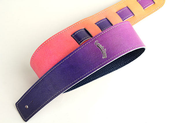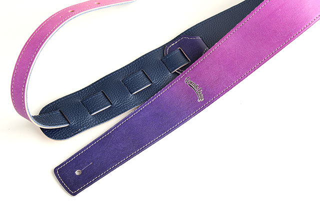 全て手作業で製作する高級本革レザーを採用した柔らかな質感のサドルレザー (ヌメ革G-Premium) に、Grande uomoの職人さんによって丁寧に仕上げられる美しいグラデーションの染色。しっとりとした手触りのサドルレザーを表面に、イタリアンレザー(シュリンク)を裏面に採用し、Sunset Fadeと名付けられたGradationは、Grande uomoならではのセンスで非常に美しい色彩が魅力の1本に仕上がっています。肩口の幅が6.35cmギター接続部(剣先)が42mmスタイリッシュながらも幅広なギターストラップSlimタイプとなります。