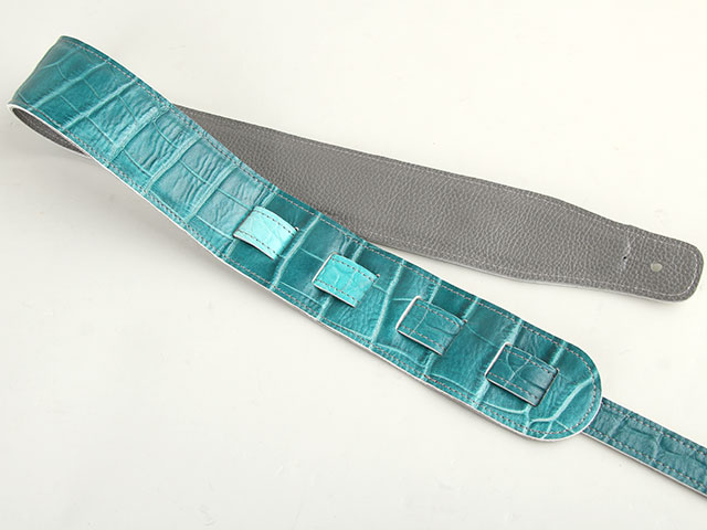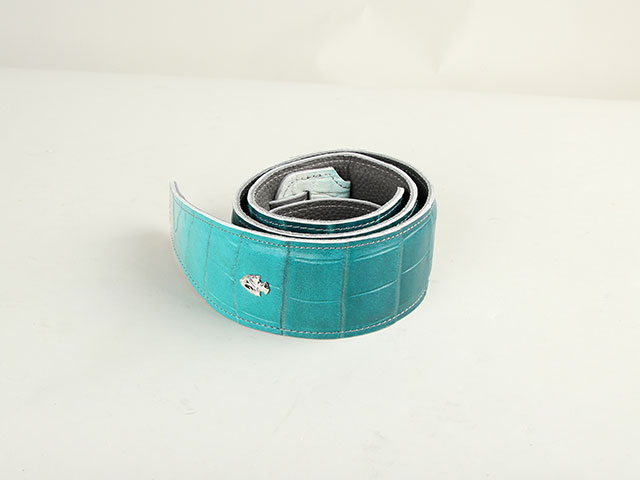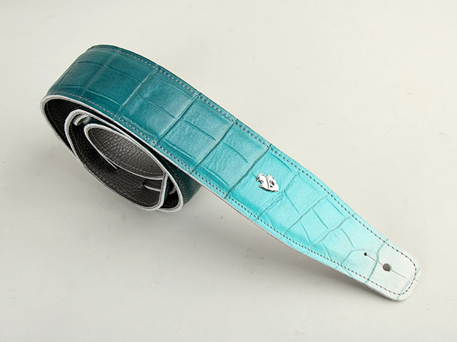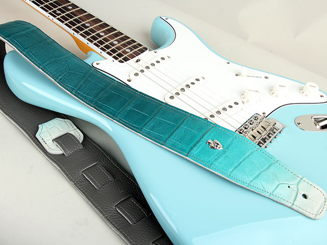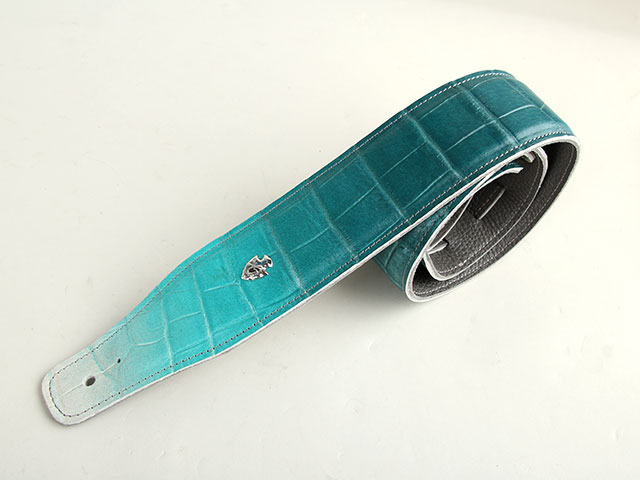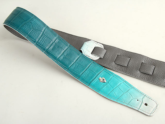 楽器を華やかに彩る、CS G-Premium Crocodile Hand Dye #4は、手染めによって深みのあるDeep Aqua Greenカラーのグラデーションで染色され、落ち着いた雰囲気のデザインに仕上げられています。先端部分が白に近いブルーであることがこの染色のポイントでもあり、G-Premiumでしか成し得ない美しさでもあります。