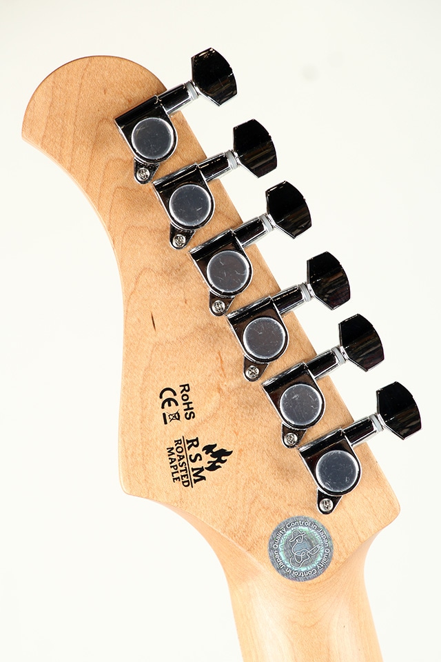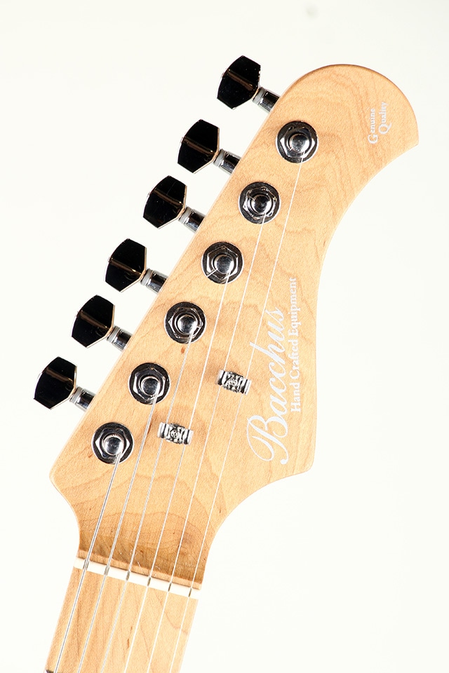 ネックにはBacchusの新機軸でもあるローステッドメイプルを採用。ローストする工程上でゆがみが生じてしまうような木材はその時点で淘汰されるため、ネックとして搭載されている個体は非常にゆがみやねじれに強く、比較的手に取りやすい価格帯ながら長い間ご愛用できる仕様となっております。