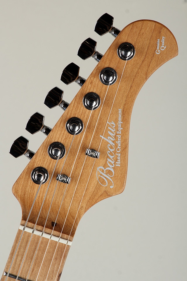 ネックにはBacchusの新機軸でもあるローステッドメイプルを採用。ローストする工程上でゆがみが生じてしまうような木材はその時点で淘汰されるため、ネックとして搭載されている個体は非常にゆがみやねじれに強く、比較的手に取りやすい価格帯ながら長い間ご愛用できる仕様となっております。