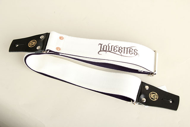 美しい白にLOVEBITESのかっこいいロゴマーク、剣先部分にはMiyakoさんのロゴマークが堂々とプリントされた上品さと力強さが感じられるコラボレーション作品。