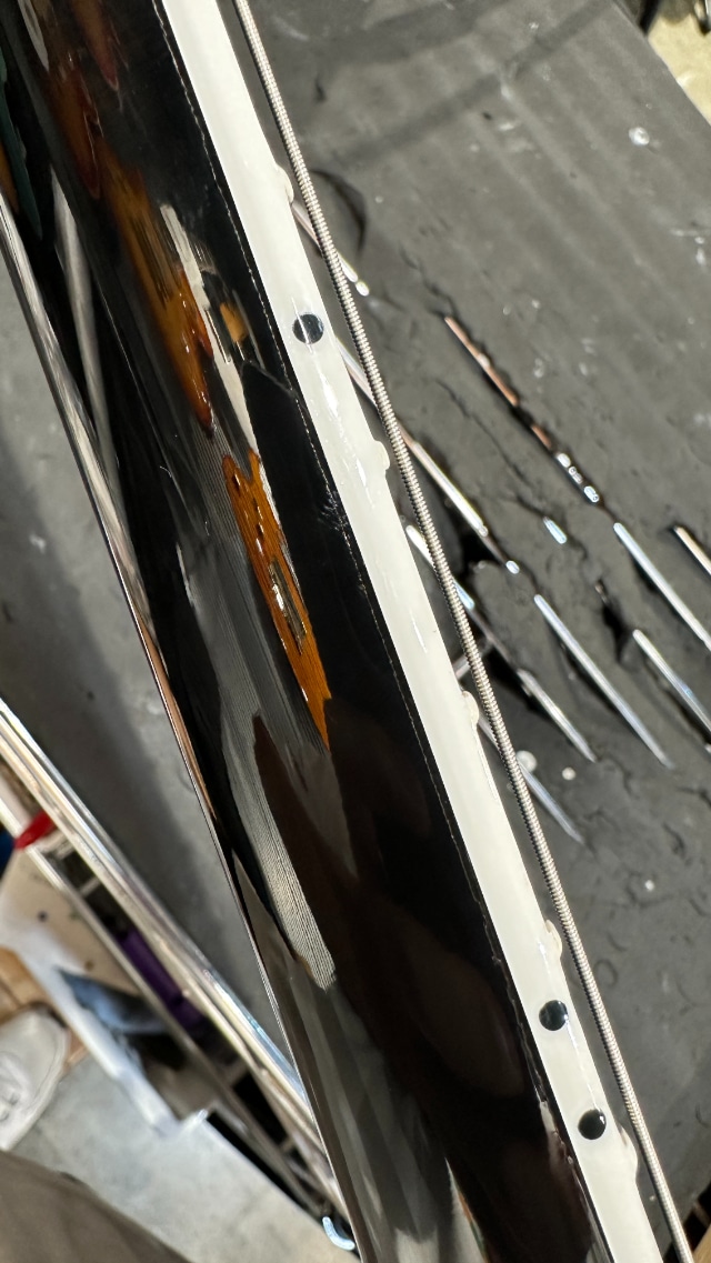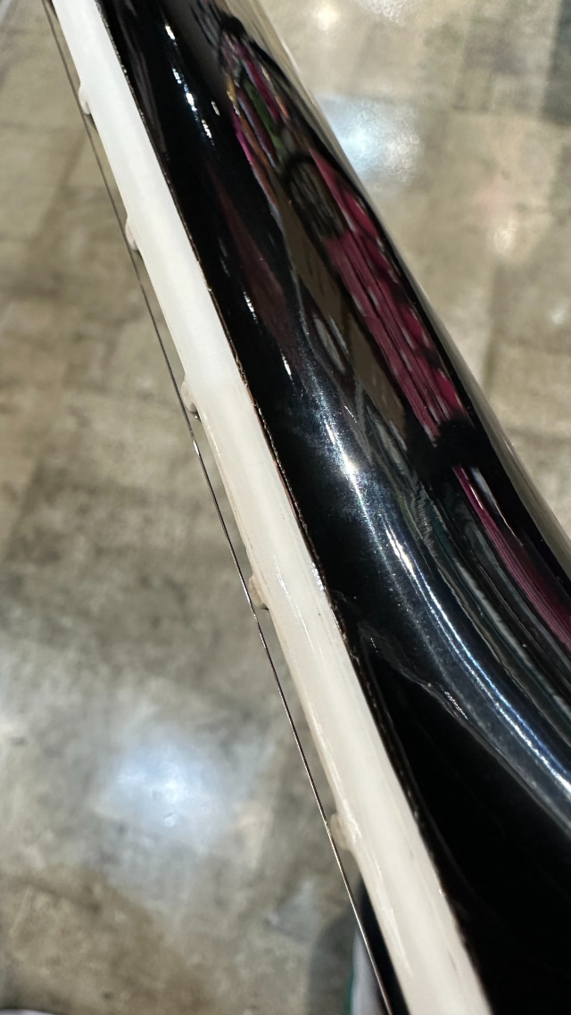 6弦側1フレットから15フレットあたり、1弦側では5フレットから15フレットあたりにかけてバインディングに沿っての塗装クラックがございます。手で触ると多少の凹凸が感じられますが演奏面での支障は感じられません。