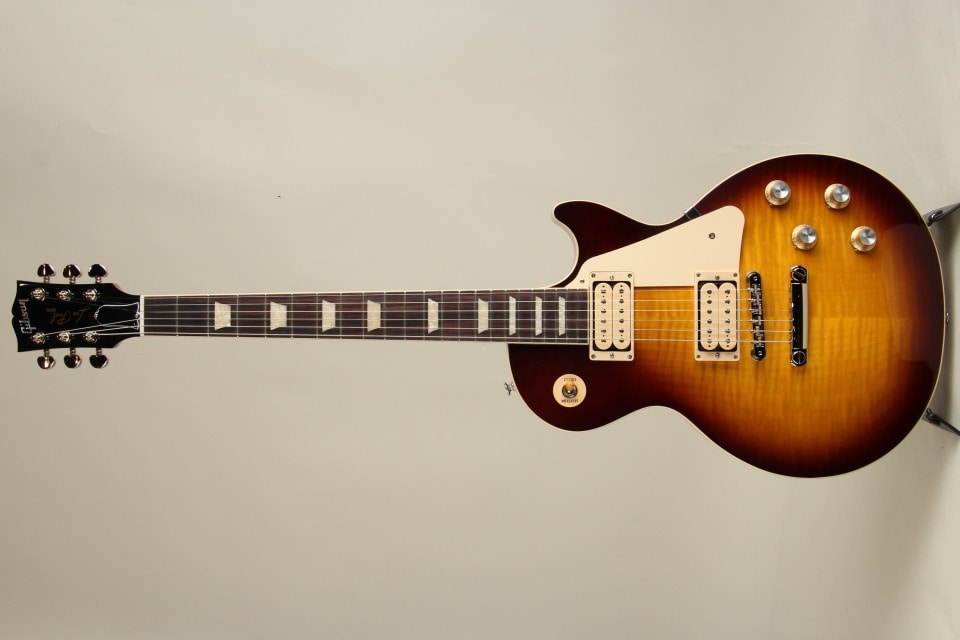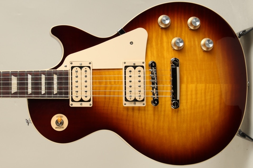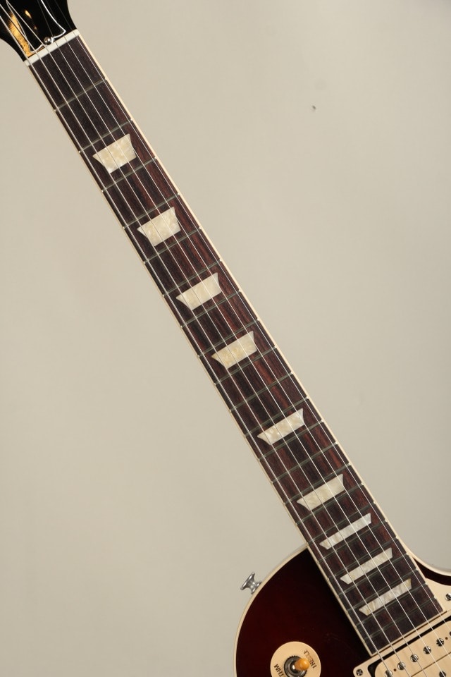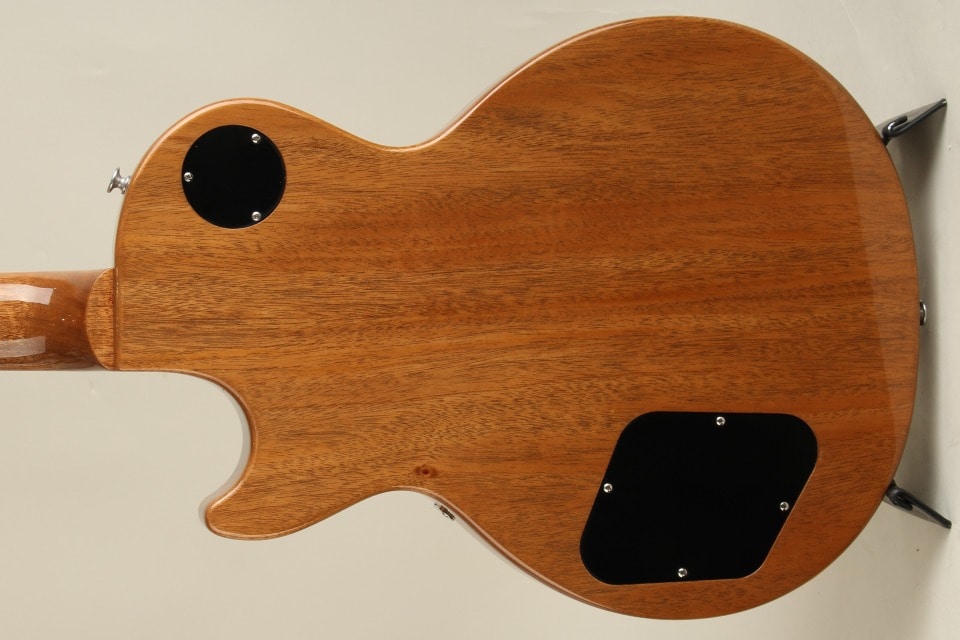 現行モデルとしてラインナップされているLes Paul Standard 50s / Les Paul Standard 60s をベースに、ピックアップカバーを装着しないオープンタイプに加え、両側ともにホワイトカラーのボビンで構成される通称ダブルホワイトのバーストバッカーピックアップを搭載。使用されている塗料は現行モデルと同じくニトロセルロースラッカーですが、現行モデルは50年代当時に製作されたときと同じ完全な新品仕上げとなっておりますが、当モデルはヴィンテージのような経年による風合いを再現するため現行モデルとは違いクリア塗装に着色が施されたフィニッシュが採用されております。メイプルトップのマホガニーボディ / マホガニーネックのローズウッド指板といった伝統的なウッドマテリアルを採用、ピックアップにはアルニコ2マグネット採用のBurstbucker 1 / Burstbucker 2 を搭載しております。ネックシェイプは50年代を意識した丸みがありしっかりとした握りごたえのある50s Vintage シェイプを採用。軽量化を目的とした肉抜き加工であるウエイトリリーフは施されていない完全なソリッドボディとなっております。