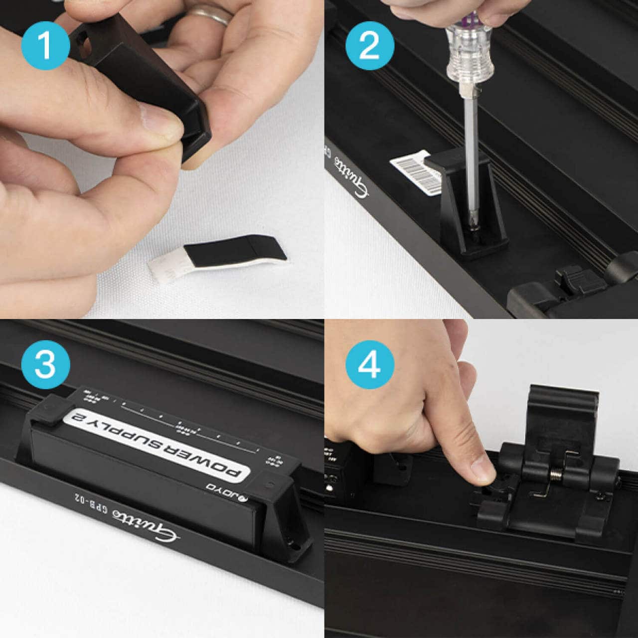 ボード下に電源を収められるため、天面のスペースを最大限に活用できます。電源やケーブルが視界に入らず、踏み間違いを減らし、見た目もすっきり。折りたたみ機構により、使用時は十分な剛性を確保しつつ、撤収時は薄く畳んで省スペースで持ち運べます。高さ31~35mm・奥行き54mm以下・長さ140~155mmのパワーサプライに適合します。