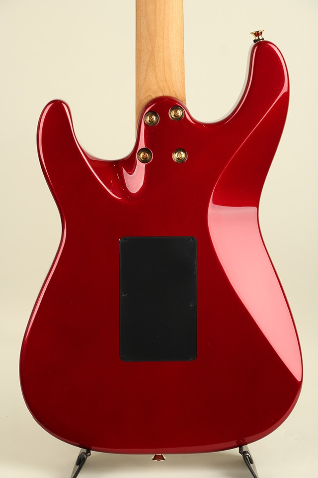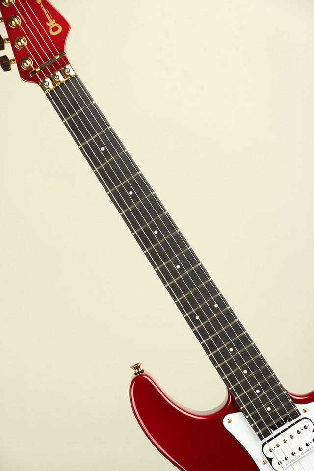 初めにルックス面からですが、きらきらとラメが入ったキャンディーアップルレッドカラーのマッチングヘッド使用になっており、ハードウェアはゴールドパーツに統一、黒いエボニー指板とは反対にピックガード、ピックアップボビンにはホワイトカラーが採用され、妖艶さや高級感を漂わせる一本となっております。