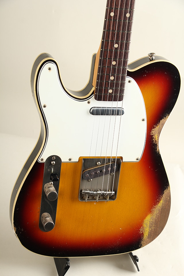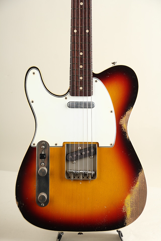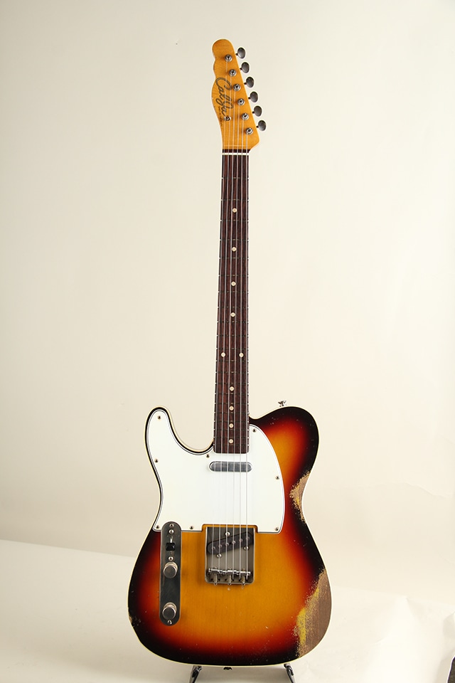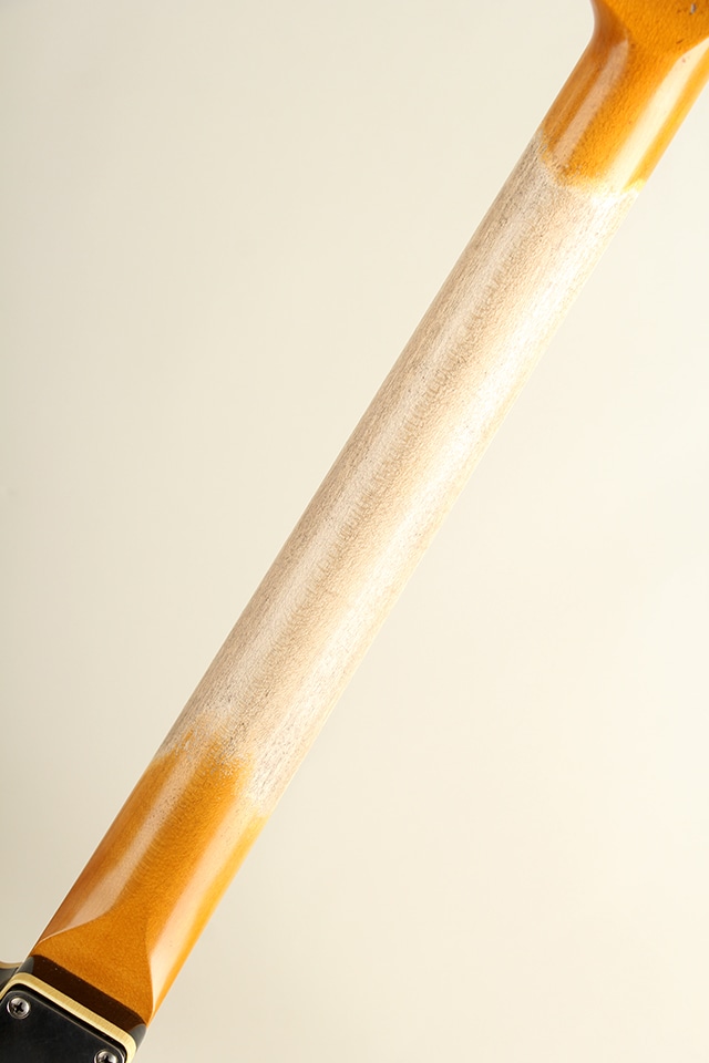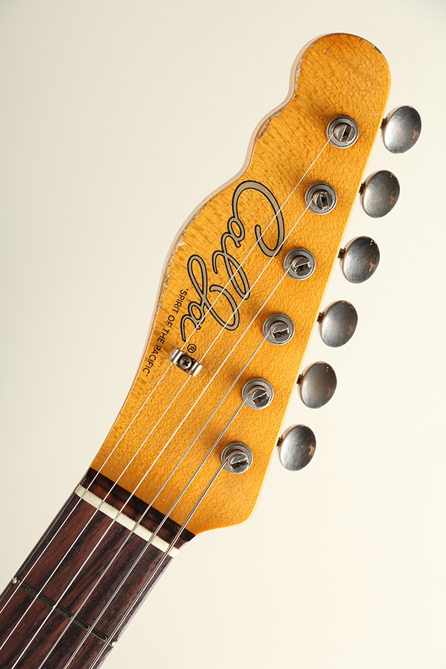 当機は60年前期のカスタム・テレキャスターをベースとしたバウンドボディ仕様モデル”CJT-60DB”。アルダーボディ、スラブ貼りローズ指板にメイプルネックといったウッドスペックが採用。ボディ厚が約41mmと一般的なテレキャスターよりもやや薄い点も特徴で、軽量かつ取り回しとフィット感の良さも魅力です。指板アールは9.5Rにミディアムジャンボ・フレット仕様といった演奏性を考慮したスペックとなっております。全体に施されたリアルなAged加工に貫禄たっぷりの仕上がりとなっております。