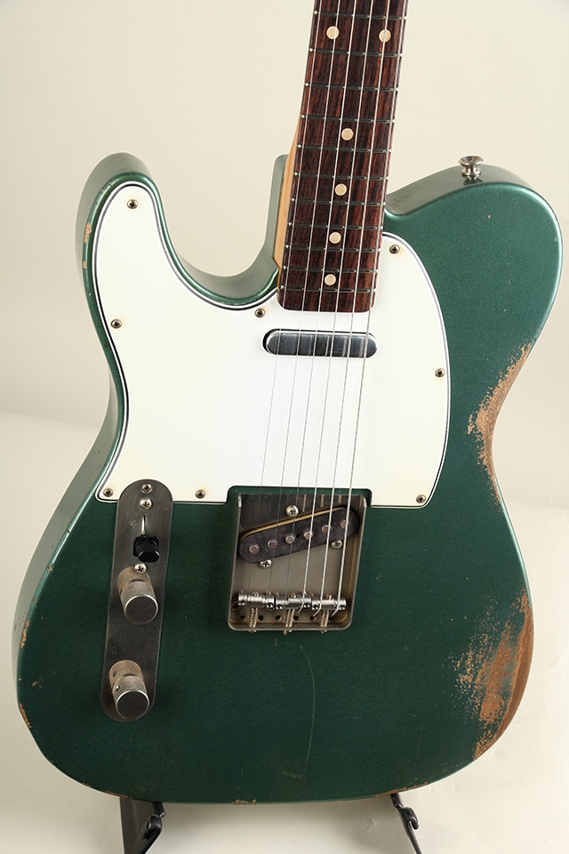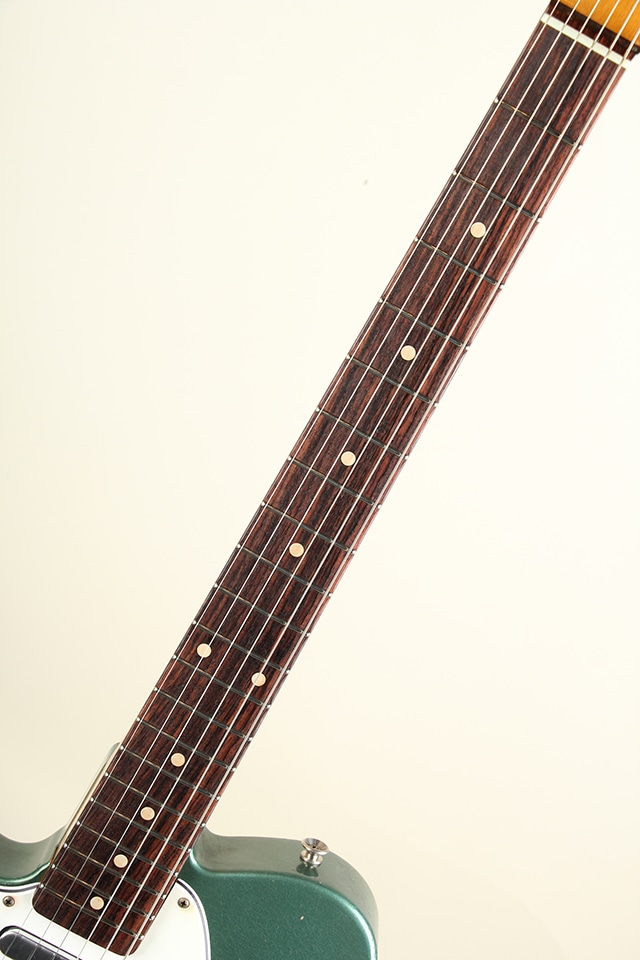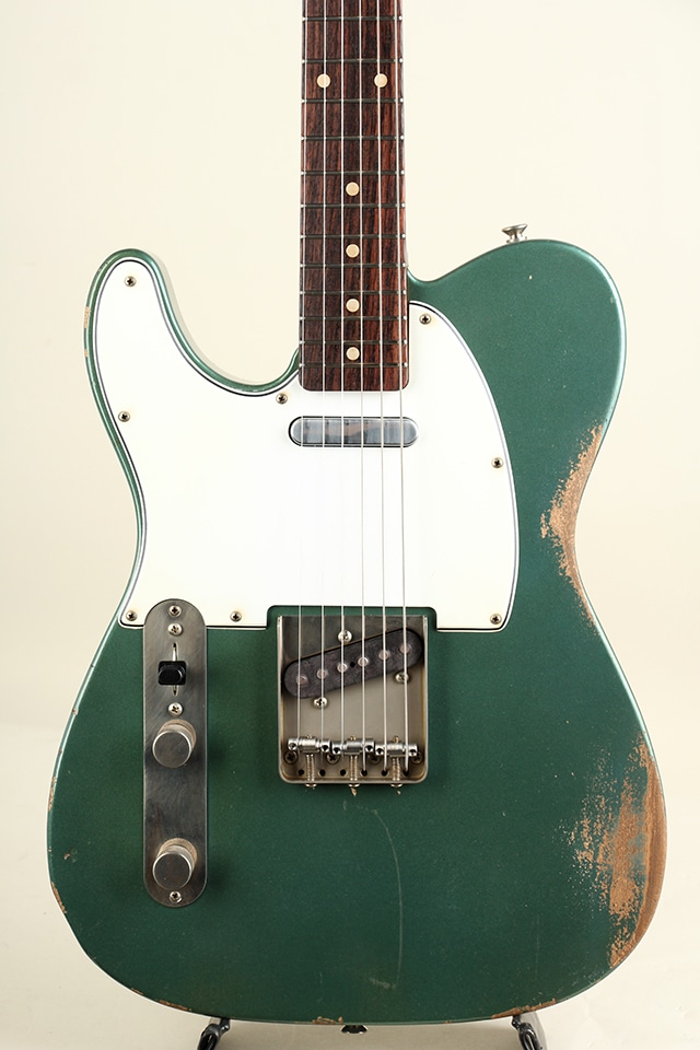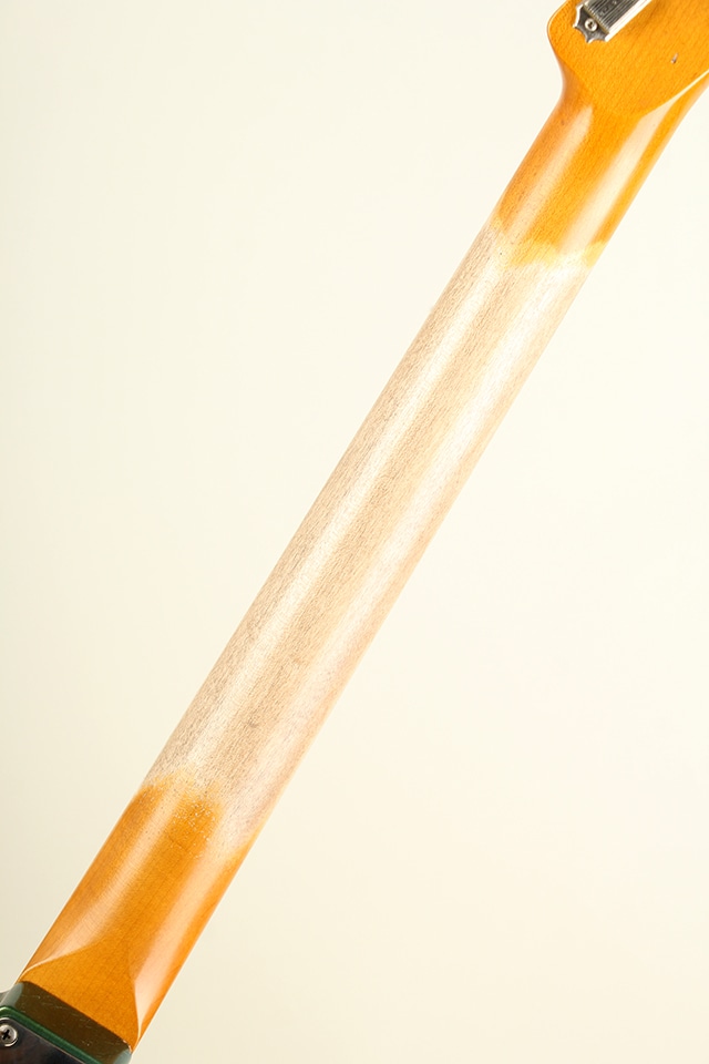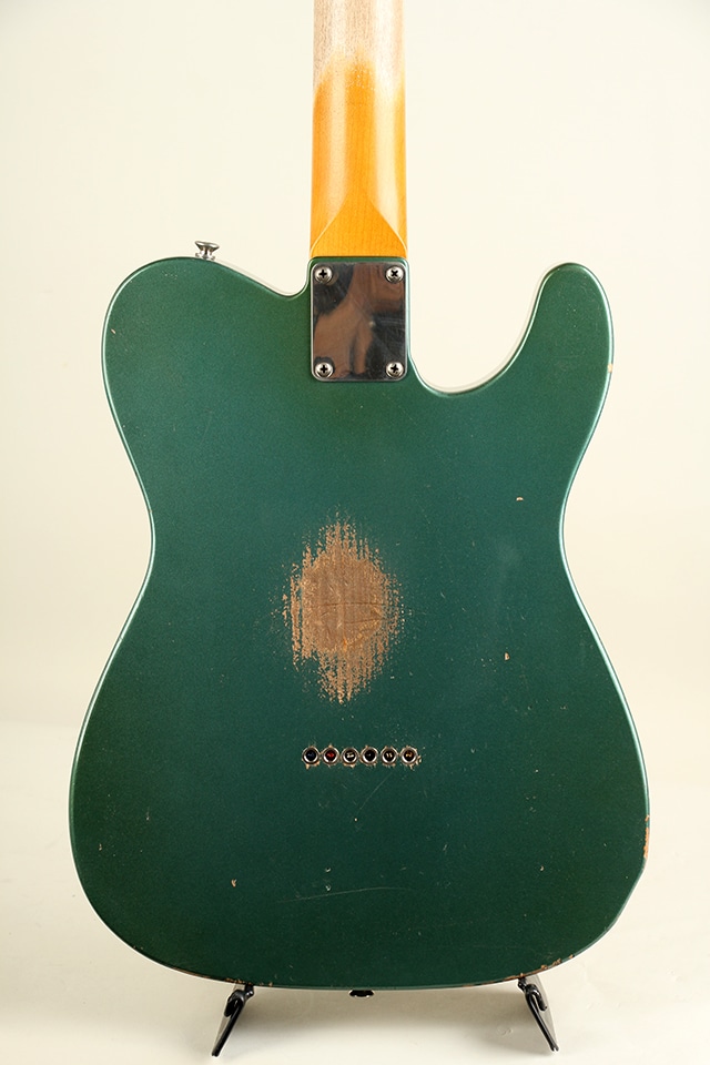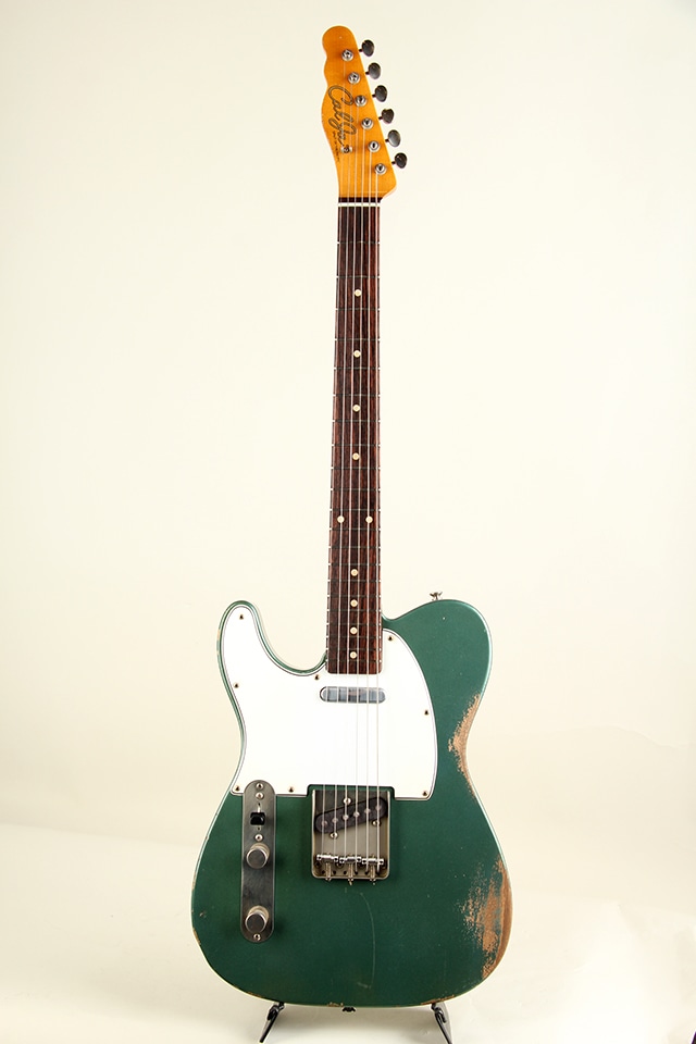 当機は60年前期仕様をベースとしたテレキャスターモデルCJT-60。アルダーボディ、スラブ貼りローズ指板にメイプルネックといったウッドスペックが採用。指板アールは9.5Rにミディアムジャンボ・フレット仕様といった演奏性を考慮したスペックとなっております。全体に施されたリアルなAged加工に焼けたシャーウッド・グリーン・メタリックカラーが貫禄たっぷりの仕上がりとなっております。