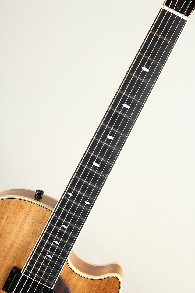 当モデルは14.75インチ/シンボディのフルアコ構造、ボディ材には限定生産として特別にブラックウッドが使用されており、エボニー指板、ブリッジ&テールピース、24 3/4インチスケール、14フレットジョイントを併せ持つ、ジャズプレイヤーに馴染み深いやや幅広のナット幅で、薄く弾きやすいネックとなっております。