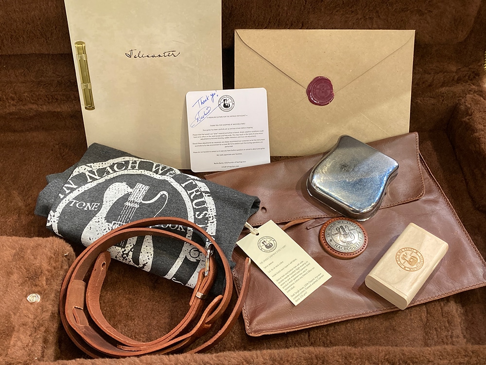 ツィードハードケースの他、50年代当時のFender資料のコピー、スペックシート、オリジナル・レザーバック、ブリッジプレート、当機の画像データが入ったUSBとUSB用の木箱の他、オリジナルTシャツとストラップも付属します。