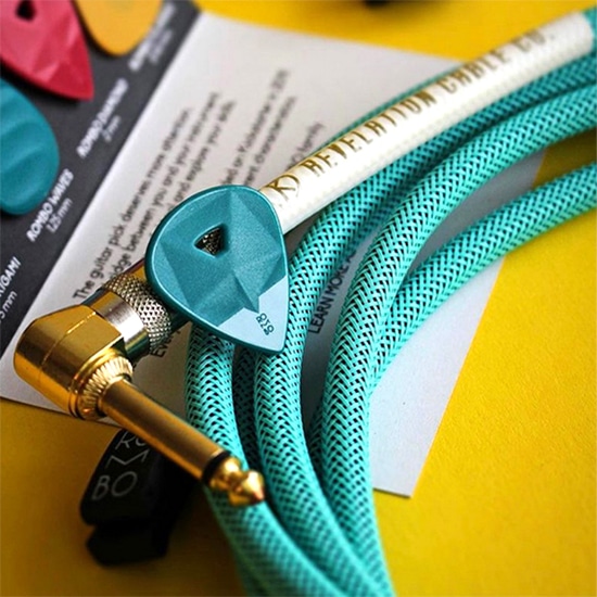 〈 The Turquoise MKII 〉 Klotz AC106SW with Turquoise MDPC sleeving The Turquoise MkIIでは、以前使用していたGotham GAC-1 Ultra-ProからKlotz AC106SWケーブルに変更。Klotzは柔軟性、音色、そして品質の安定性において優れており、無色透明・純粋なサウンドながら、力強さもあり、アコースティックギターやキーボードなどナチュラルなサウンドを求める方にもとてもおすすめです。 The Turquoise MKIIはターコイズブルーカラーの最高水準ツイードMDPCスリーブを使用することによって耐久性が高められています。AC106SWは、Van Dammeケーブルと比較してやや太く、TechFlexやMDPCスリーブを使用しているため直径7.4 mm (0.29インチ)となりますが、柔軟性に優れているため最高の使い心地を実感いただけます。G&Hニッケルとゴールドのコネクタ、そしてゴールド・ロゴ・プリントを白色ヒートシュリンクを施工。 Klotz AC106SW は、とても頑丈でありながら究極の静電容量を実現。ドイツの高品質エンジニアリングによって生み出されたケーブルは、ギター、キーボード、その他ラインレベルの機器への接続用ケーブルとして最適な非常に透明感のあるサウンドを出力。それでいてパンチのあるサウンドが魅力で、バンドサウンドでも埋もれることなく繋いだ楽器の本来の魅力を引き出します。あらゆるノイズからの耐性があり、過酷なライブステージにも耐えうる信頼度で、長年使用いただける丈夫な万能ケーブルです。 →静電容量29pF/Feet (95pF/Meter) →24 AWG 裸銅導体シールド →スパイラル・シールド、伝導性pvc塩化ビニール →直径 0.29インチ (7.4 mm) → G&Hニッケルとゴールドのコネクタを標準装備。 → 鉛フリー、ROHS準拠、銀ハンダ。