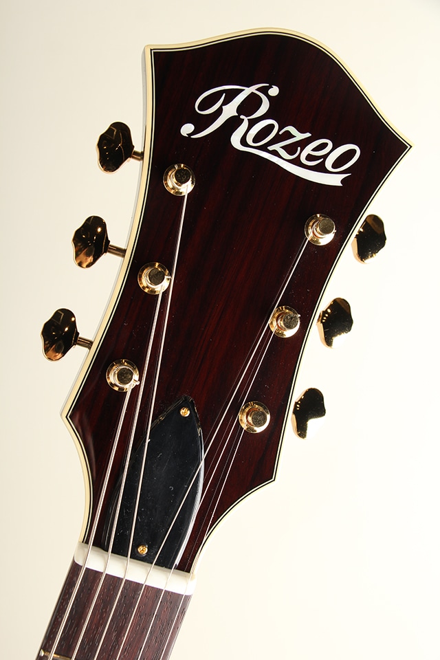 そんな寺田楽器のプロジェクト”Terada One Products”。現場の若き職人による設計、企画を具現化する意欲的なプロジェクトです。こちらは気鋭の職人”樋口 恭大(ヒグチ キョウダイ)”氏の設計、企画によるブランド”Rozeo”のコンパクトモデル”Ladybug。14インチの小振りなボディ、そして氏によるオリジナルデザインのfホールが、どことなくレトロな雰囲気の良い小型フルアコです。「小粋なブルースマンがさりげなく爪弾くイメージで設計しましたが、完成してみると案外ソロギターやジャズ系フレーズにも合う楽器に仕上がりました(樋口氏)」という言葉のとおり、サイズからは想像出来ない程のバランスの良い豊かな音色を聞かせてくれ、心地よい音量感や音の深み等、純粋に演奏することの楽しさを思い起こさせてくれる楽器です。