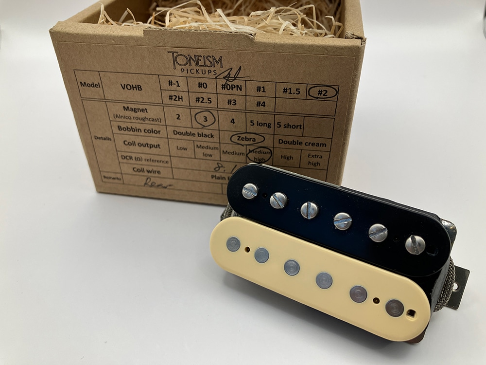 当モデルVOHB #2は、王道の50's 仕様を追求したリア搭載を前提としたタイプで、フロントとのバランス、ポジションによるトーンの違いを考えて抜け感、分離の良さとクリーミーさを調整をしています。ややゲインを上げ歪みとの相性も考慮されたリア向き、当店販売のVOHB #1 Zebra S/N:5 0798とのセットもお勧めです。