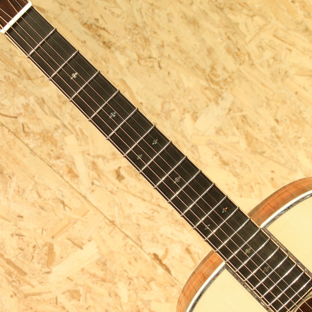 1962年より福岡久留米にてギター製造を行う老舗純国産ギターブランド、アストリアスギター。現在もベテランを中心とした約15名のスタッフで運営しています。本器は弊社スタッフが久留米の工房にて現地材選定を行ったカスタムオーダー品。同ブランドのハイエンドモデル"E.C.EMBLEM"をベースに材木やピックガードなどのパーツまでハンドピックし厳選された部材で作り上げられた1本です。きめ細やかで美しいジャーマンスプルーストップ、通常ラインナップにはないココボロをサイド&バックに使用。マホガニーネック、エボニー指板&ブリッジ、ゴトー製オープンゴールドペグ、アバロントーチインレイ/スノーフレイク指板インレイ、アバロンパーフリング&ロゼッタ、メイプルヘッド/ネック/ボディバインディング、ダイヤモンドボリュート、トーティスピックガード、ノンスキャロップドXブレーシング、オールラッカー仕上げ。重たく硬質な特性を持つココボロ材、ロングスケールの張りのあるトーンとの相性は良く、小振りなサイズながら堅牢で力強く、美しい高音域が魅力なサウンドを生み出します。ポロンと爪弾けば、煌びやかで芯のある音粒を奏で、分離感のあるクリアで整ったサウンドバランスの音色をお楽しみいただけます。小ぶりがゆえに、音の立ち上がりが早くタッチレスポンスに優れた本モデル。45mmナット幅、645mmのロングスケール仕様、心地よい倍音もふくみフィンガースタイルに最適なギターです。力強いストロークにもしっかりと対応、明瞭な音像でぼやけることもなくノンスキャロップXブレイシングらしい芯の太さを出しながら安定したストロークサウンドも魅力です。ハイエンドモデルから更なるグレードアップが施されたカスタムモデル。レギュラーモデルとは一線を画したそのルックス、サウンドを是非お手元でご体感ください。持ち運びや保管に適したスーパーライトケースが付属します。