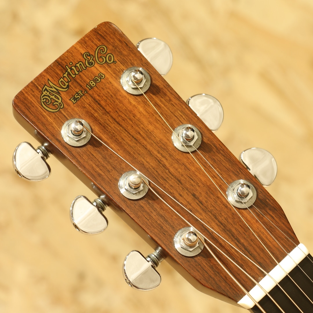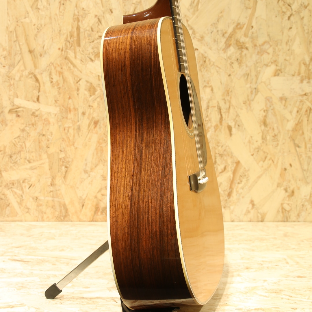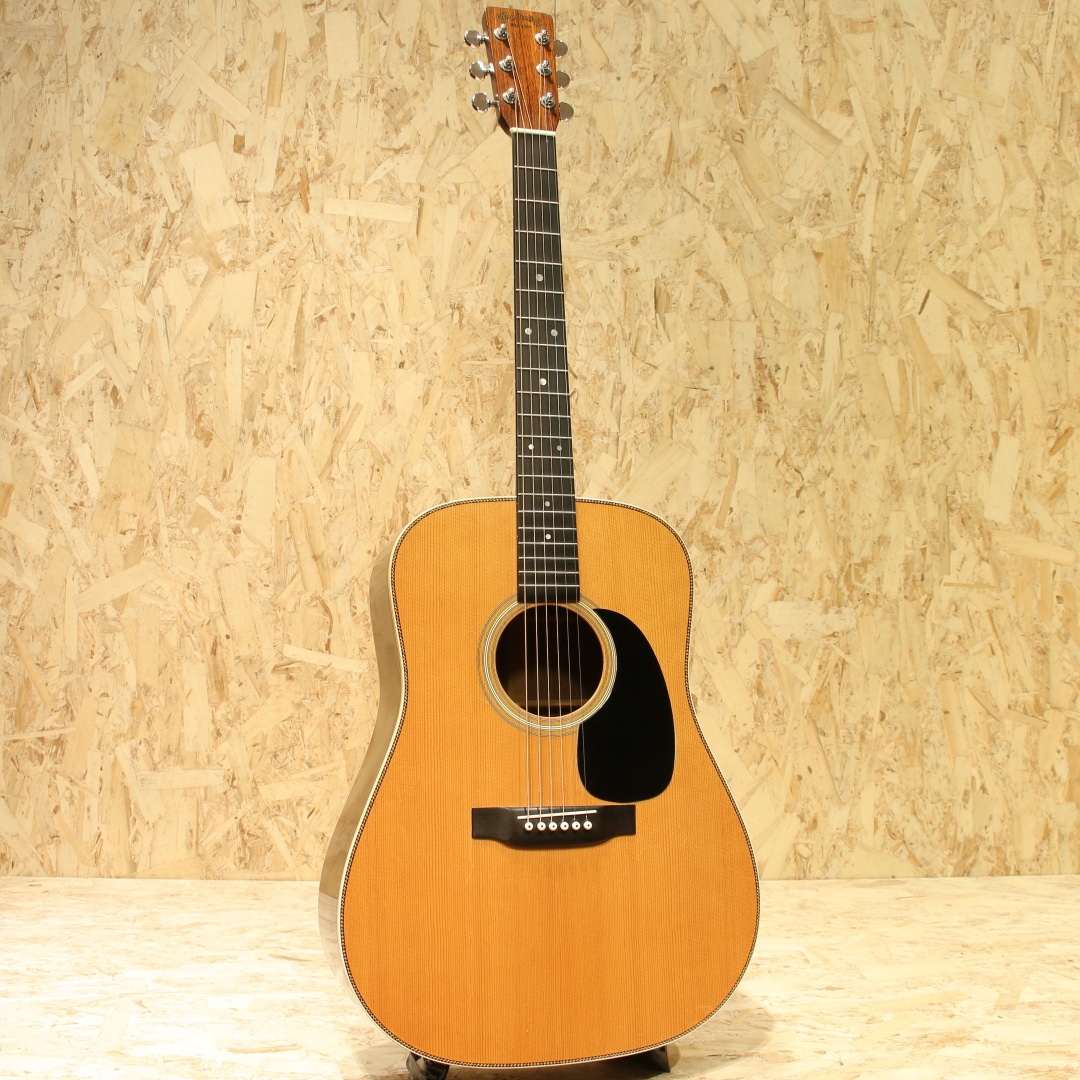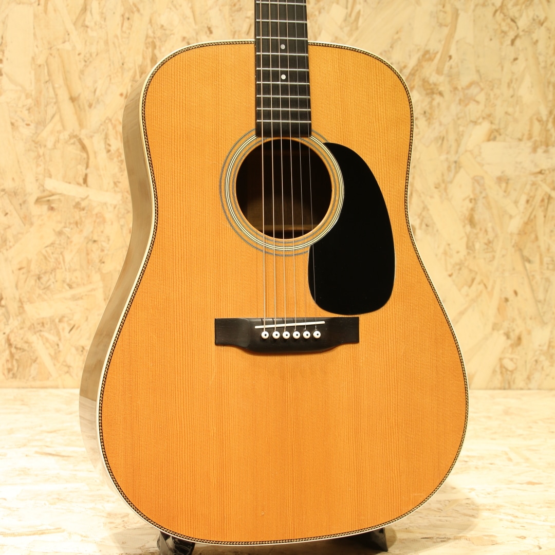 マーチンギターの中で最も有名なモデル"D-28"。現在同様の14fジョイントのドレッドモデルとして1934年に誕生してから、時を超え今もなお愛されるワールドスタンダードモデル。1944年にオリジナルスキャロップブレイシングが廃止された後、32年の時を経て現代に甦ったスキャロップブレイシング採用モデルの先駆け"HD-28"。どの時代においてもスタンダードである"D-28"を基にオールドテイストを持ったモデルとして、現在もラインナップを続けるロングセラーモデルのひとつです。本器は1977年製、製造初期頃の1本。いい具合に焼けた飴色のスプルーストップ、ローズウッドサイド&バック、マホガニーネック、スクエアロッド、エボニー指板&ブリッジ、グローバーロトマチックペグ、ブラックピックガード、ヘリンボーントリム、ジグザグバックストリップ、スキャロップドXブレイシング。戦前期の象徴であるヘリンボーントリム、当時のD-28をベースとし、Herringborn Dreadnoughtの頭文字を取ったネーミングとして名づけられました。当時のD-28と比較するとスキャロップブレイシングによって空気感の強い、ふくよかな響きを獲得。現行品のHD-28と比較するとブレイシングの位置が異なりフォワードではないため、芯の強く輪郭を感じやすい締まったサウンドが特徴です。70'sらしい重厚かつ基音の太いトーン、程よく含まれる空気感を纏い、ぼやけずに軽くなり過ぎず、ふくよかなサウンドをアウトプット。やや甘く線の太い音色はこの時期を象徴といえます。もちろんニッパチを感じる整ったサウンドバランスや癖のない扱いやすさも健在です。ナット幅は42.9mmでやや細身な緩やかなVシェイプ。親指で握り込んだ演奏スタイルにも対応しやすく、手馴染みの良さにも定評があり現行品のナット幅が広いと感じられている方にはオススメのネックグリップです。ネックヒール箇所に一度ストラップピンが取り付けられた跡があり、現在は埋められています。ピックガードは同じブラックカラーのモノへと交換されていますが良い雰囲気が保たれています。ネック裏1-5フレット付近の細かな打痕、ブリッジ6弦側のトップ面に長めの打ちキズ、その他擦り傷や打痕が見られますが、年代を考慮すれば綺麗な状態が保たれており、大切に扱われてきたことのうかがえる本器。ボディやヘッドの塗装に曇りが見られますが、この年代の当たりによく見られる症状ですのでご使用上での影響はございません。ネック周りの状態も良好に保たれ、標準的なセッティングでプレイアビリティにも優れた1本です。70'sサウンドをお探しの方はもちろん、これから古き良きサウンドをお求めの方は是非お試しください。ロゴが欠損しておりますがオリジナルハードケースが付属します。