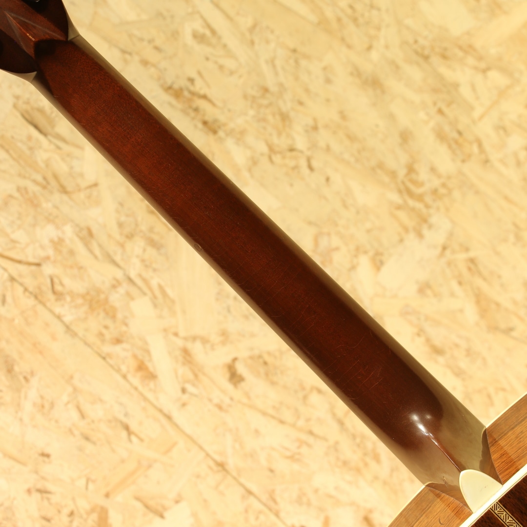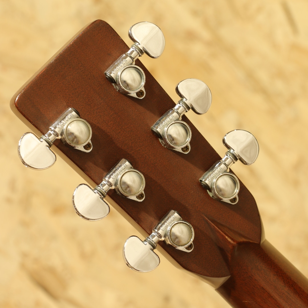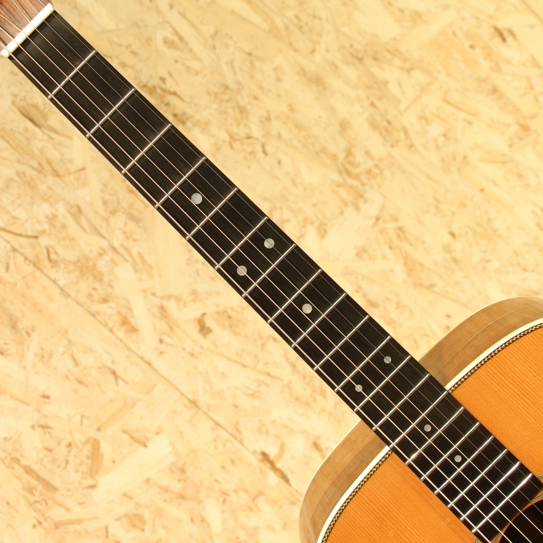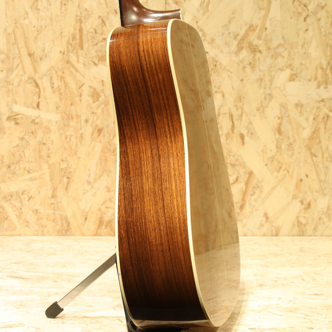 マーチンギターの中で最も有名なモデル"D-28"。現在同様の14fジョイントのドレッドモデルとして1934年に誕生してから、時を超え今もなお愛されるワールドスタンダードモデル。1944年にオリジナルスキャロップブレイシングが廃止された後、32年の時を経て現代に甦ったスキャロップブレイシング採用モデルの先駆け"HD-28"。どの時代においてもスタンダードである"D-28"を基にオールドテイストを持ったモデルとして、現在もラインナップを続けるロングセラーモデルのひとつです。本器は1977年製、製造初期頃の1本。いい具合に焼けた飴色のスプルーストップ、ローズウッドサイド&バック、マホガニーネック、スクエアロッド、エボニー指板&ブリッジ、グローバーロトマチックペグ、ブラックピックガード、ヘリンボーントリム、ジグザグバックストリップ、スキャロップドXブレイシング。戦前期の象徴であるヘリンボーントリム、当時のD-28をベースとし、Herringborn Dreadnoughtの頭文字を取ったネーミングとして名づけられました。当時のD-28と比較するとスキャロップブレイシングによって空気感の強い、ふくよかな響きを獲得。現行品のHD-28と比較するとブレイシングの位置が異なりフォワードではないため、芯の強く輪郭を感じやすい締まったサウンドが特徴です。70'sらしい重厚かつ基音の太いトーン、程よく含まれる空気感を纏い、ぼやけずに軽くなり過ぎず、ふくよかなサウンドをアウトプット。やや甘く線の太い音色はこの時期を象徴といえます。もちろんニッパチを感じる整ったサウンドバランスや癖のない扱いやすさも健在です。ナット幅は42.9mmでやや細身な緩やかなVシェイプ。親指で握り込んだ演奏スタイルにも対応しやすく、手馴染みの良さにも定評があり現行品のナット幅が広いと感じられている方にはオススメのネックグリップです。ネックヒール箇所に一度ストラップピンが取り付けられた跡があり、現在は埋められています。ピックガードは同じブラックカラーのモノへと交換されていますが良い雰囲気が保たれています。ネック裏1-5フレット付近の細かな打痕、ブリッジ6弦側のトップ面に長めの打ちキズ、その他擦り傷や打痕が見られますが、年代を考慮すれば綺麗な状態が保たれており、大切に扱われてきたことのうかがえる本器。ボディやヘッドの塗装に曇りが見られますが、この年代の当たりによく見られる症状ですのでご使用上での影響はございません。ネック周りの状態も良好に保たれ、標準的なセッティングでプレイアビリティにも優れた1本です。70'sサウンドをお探しの方はもちろん、これから古き良きサウンドをお求めの方は是非お試しください。ロゴが欠損しておりますがオリジナルハードケースが付属します。