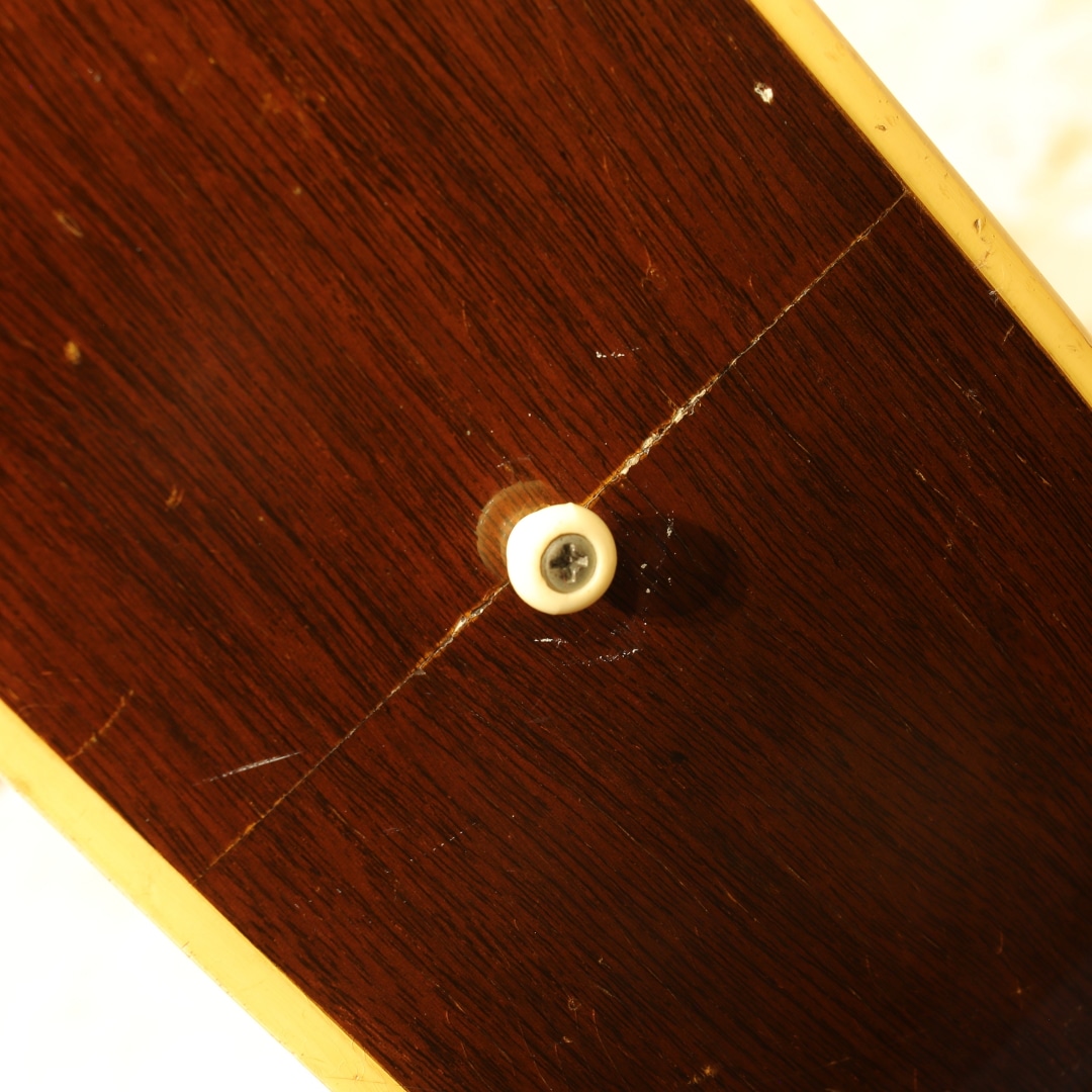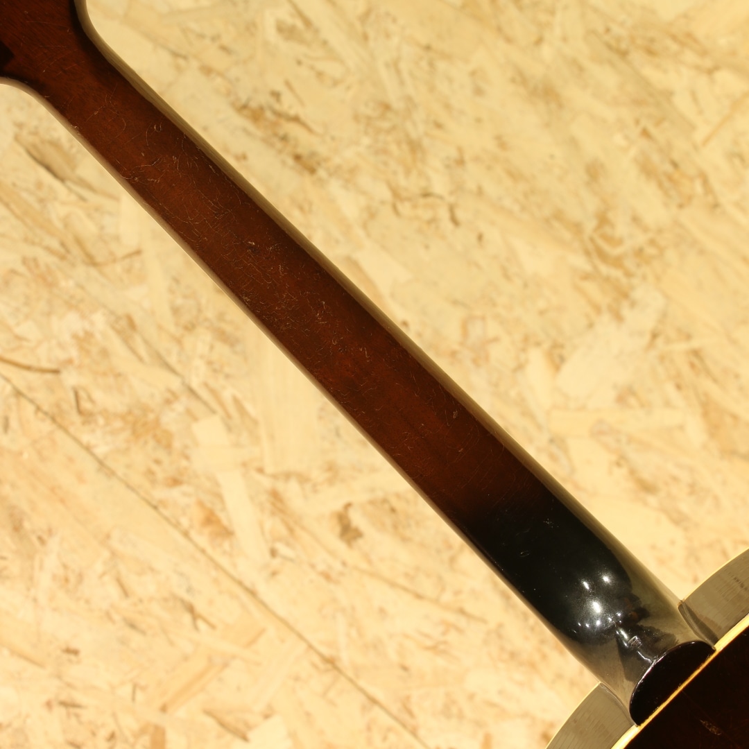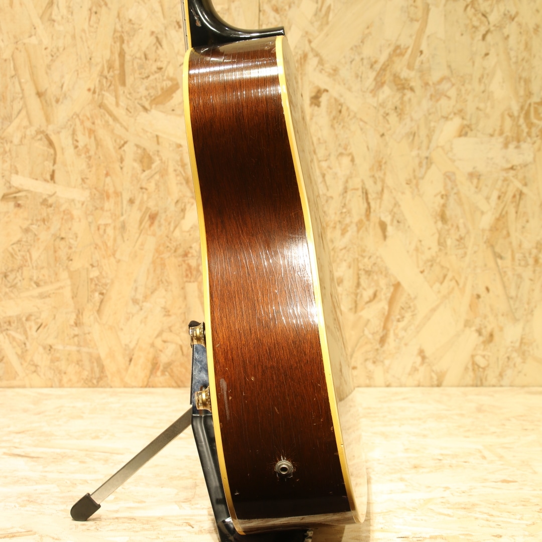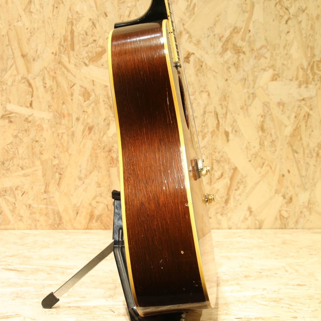 ジョン・レノンとジョージ・ハリスンがお揃いで入手したギター、ビートルズギアとしてあまりにも有名な機種である"J-160E"。1951年にアンサンブルの中でも音量で負けない様にと発表された世界で始めてピックアップが搭載されたフラットトップ"CF-100"。その基本コンセプトを受け継いだ"J-160E"は1954年に発表されました。本器は1967年製、ラミネートスプルーストップ、マホガニーサイド&バック、マホガニーネック、ハカランダ指板&ブリッジ、艶消しセラミックアジャスタブルサドル、オリジナル2こぶキーストーン"クルーソンデラックス"ペグ、クラウンヘッドロゴインレイ、ディッシュパーロイド指板インレイ、ダブルリングロゼッタ、3プライバインディング、オリジナルトートイズ柄ピックガード、ダブルリングロゼッタ、3プライバインディング、トップ構造はラダープレイシング、15フレットジョイント、ワンボリュームワントーンのP-90、ナット幅約40mm、14度ヘッド角。J-45と同じくラウンドショルダーボディですが、P-90は太くて甘い音が出しやすい位置に搭載されており、それに伴ってネックジョイントが15フレットとなっています。フレットは交換済、1-3フレットあたりの指板にへこみが見られますが僅かなもので演奏への支障はございません。J-160Eでしか味わえないカラッとドライでザクザクとしゃがれたようなサウンド、鳴らせば鳴らすほどまたかき鳴らしたくなるようなトーンは癖になります。ラダー構造による生音は賛否ありますが、数多のミュージシャンが愛用する理由はここにあります。ボリュームもたっぷり、指で鳴らせば枯れの中にもスウィートを感じるような甘さがあります。1965年頃から採用されるナローネック仕様、この弦間隔から生まれるタイトでまとまりのある独特なサウンド、ADJサドルが生み出す小気味よいパーカッシブな響きと絶妙にマッチし年代特有の音色を生み出します。野太くファットで味わいのあるピックアップサウンドも魅力の1つです。全体にラッカーチェックが見られよく使い込まれたビンテージらしい貫禄のあるルックスですが、木部に至るクラックは見られず良好なコンディションが保たれています。ネック周りの演奏性も大変良好で、ADJサドルの上下幅も残っており、まだまだこれから弾き込んでいただけるグッドコンディションです。1弦側ネックジョイント付近に木部まで達するやや深めの打痕がありますが、ご使用の上で影響がございません。同じく1弦側のサイドショルダーに塗装が溶けたような跡、サイドジャック周りの塗装欠け、サウンドホール箇所のピックスクラッチによる木部の露出など、しっかりと弾き込まれてきた跡がギブソンヴィンテージとしては嬉しいポイントではないでしょうか。全体的な打痕な擦り傷なども風合い良くさほど気になりません。この時期に見られるややフェイドしたサンバーストも良き雰囲気を纏わせます。ビートルズギヤとしては欠かせない合板ラダーのタイトな生音でも独特の枯れたドライなニュアンスは裏切りなく良いサウンドを味わって頂けます。やや年季が入った汎用ハードケースが付属します。