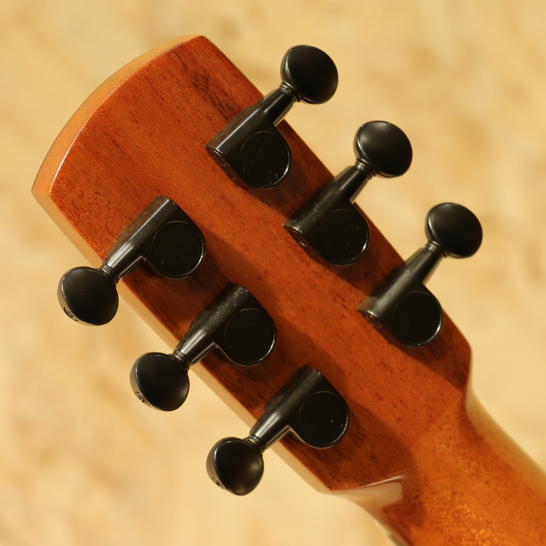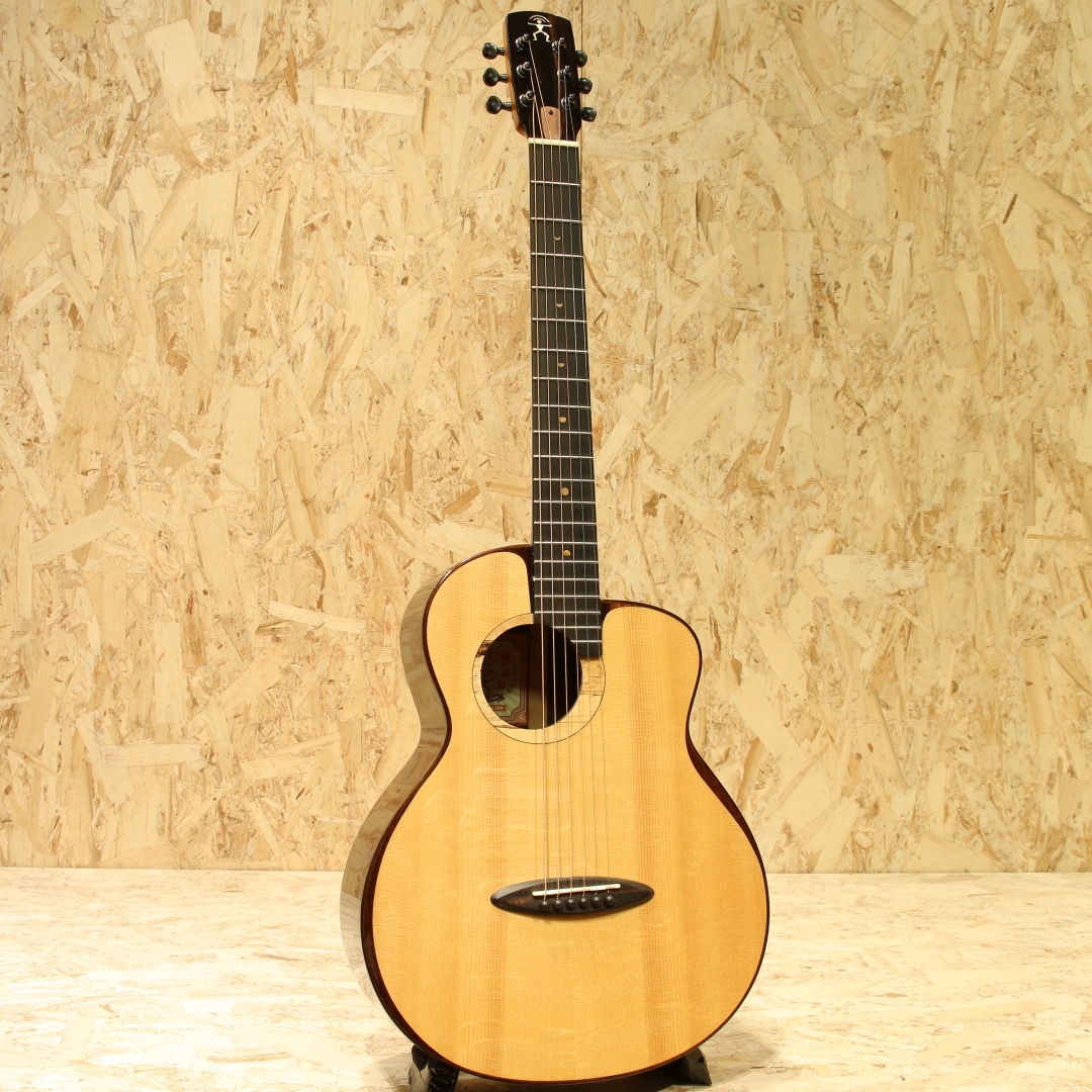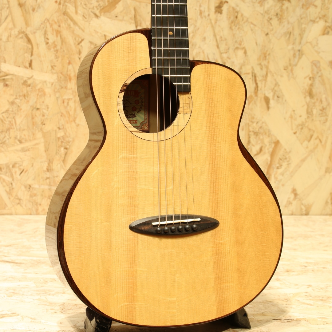 スターターモデルからプロフェッショナルモデルまで幅広く展開するブランド、aNueNue (アヌエヌエ)。可愛らしい見た目と心地良い弾き味、想像を超える音量で多くのプレイヤーを魅了します。本器は小さなボディーサイズながらもビックサウンドとクリアな音質を持ち合せるBird Seriesの最上位機種"M-200"。ムーンスプルーストップ、イーストインディアンローズウッドサイド&バック、マホガニーネック、エボニーフィンガーボード&ブリッジ、43mmナット幅、610mmスケール。オリジナルシェイプとなるコンパクトなボディサイズ、体へのフィット感は素晴らしく、ノンストレスな抱え心地です。その小ささからは想像のつかない豊かな鳴り、低音域の安定感もあり弾き語りやソロ弾きでも活躍してくれる1本です。ネック形状は程よく肉付きのあるスッキリとしたラウンドシェイプ、43mmナット幅と握りやすいサイズで初めてギターに触れられる方でも馴染みやすい形状です。月の満ち欠けを示した指板インレイやスポルテッドメイプルの木目が目を惹くロゼッタデザインなど、ルックスにも拘りが見られます。全体的に大きなダメージは見られず、表面上の擦り傷が少し見られる程度と美しい外観が保たれています。ネックコンディションも良好、収まりの良いスモールボディにショートスケール仕様と演奏性も抜群です。自宅でお手軽に弾けるギターとしてはもちろん、出先に持ち出し奏でるギターとしても大変オススメできる1本です。ブルーカラーのオリジナルハードケースが付属します。