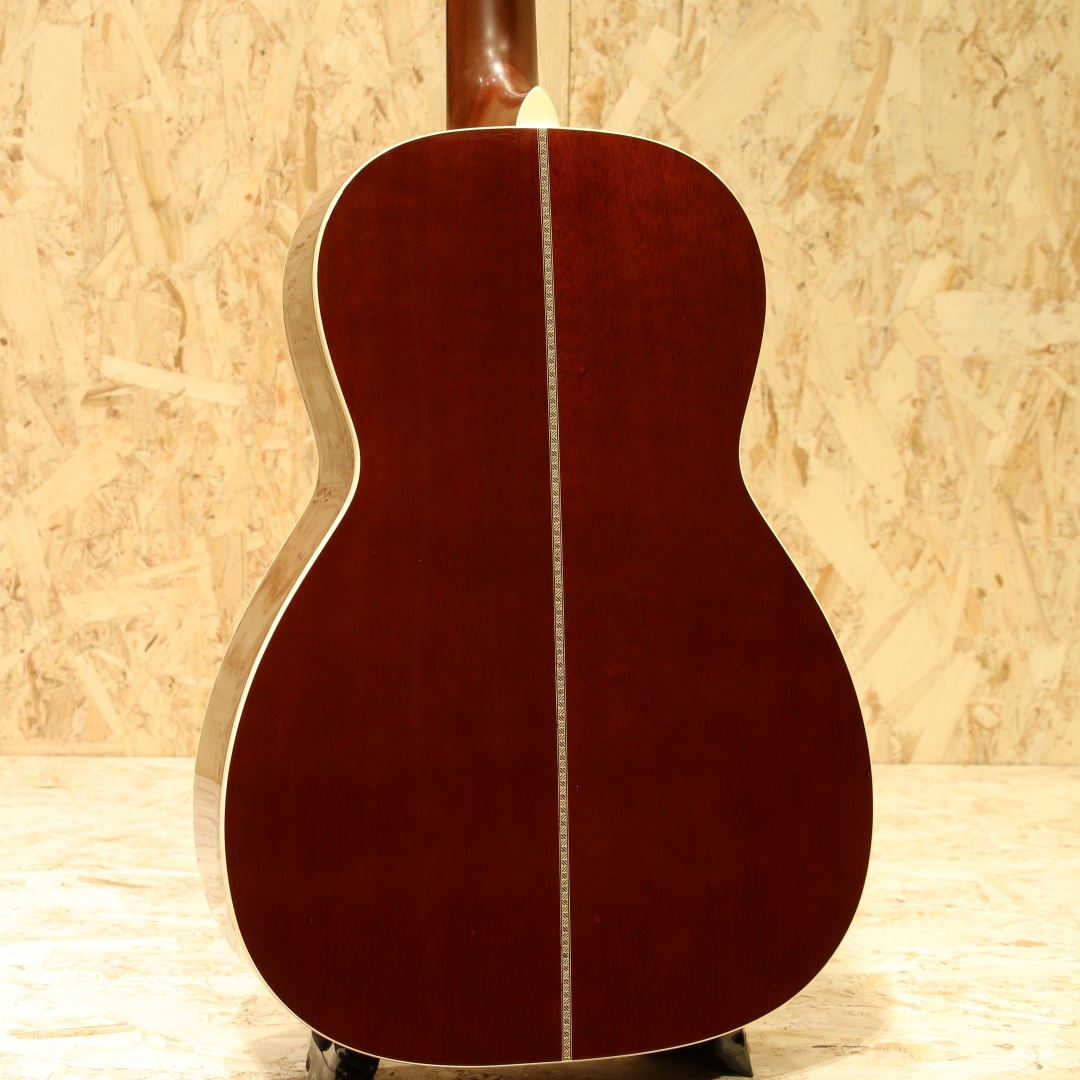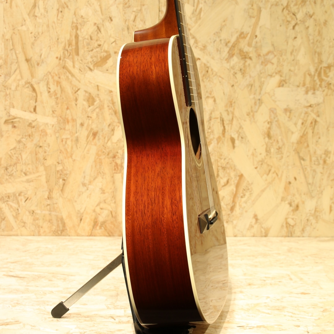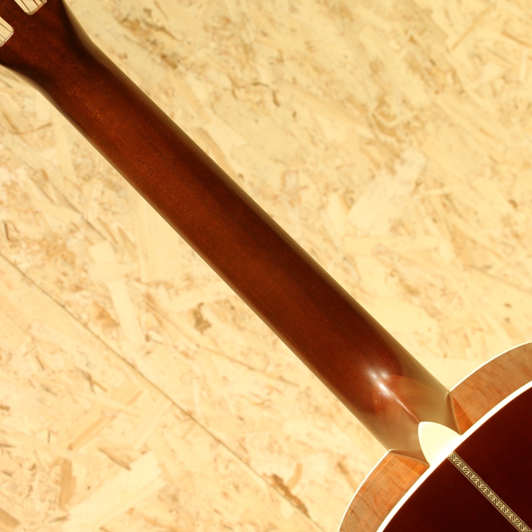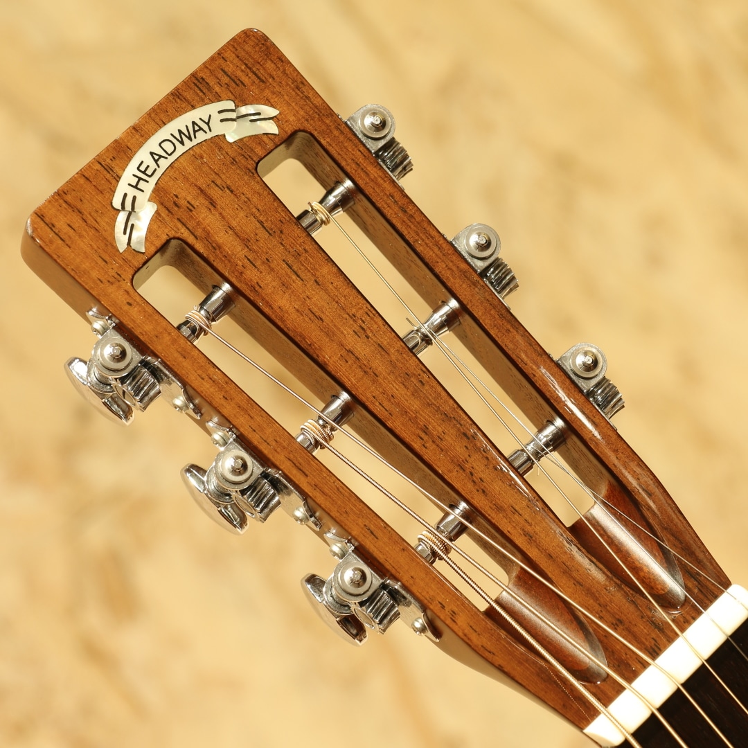 独自の工法と方法論で高品質のアコースティックギターを製作している長野県松本の老舗"ヘッドウェイ"。HEADWAYは1977年に創業、1983年には工場が2度の火災にあってしまい一度はアコースティックの製造はストップしてしまいました。2000年にはファンからの熱い要望から復活し現在まで製造を続けています。本器はヘッドウェイ創立30周年を記念して限定50本のみ製作されたオールマホガニー仕様ニューヨーカータイプ、”HN-30A/AM”。2007年製USED品です。マホガニー単板ボディ、マホガニーネック、エボニー指板&ピラミッドブリッジ、スロテッドヘッド、ゴトーペグ、ヘリンボーントリム、ジグザクバックストリップ、ウッドホースインレイ。当時HEADWAY創立30周年モデルは複数存在しており、本器はそのうちの1機種でした。スロテッドヘッド、ピラミッドブリッジ、12Fジョイントと古き良き20sマーチンを意識したであろうニューヨーカースタイル。Style18では本来見られませんが、アレンジを施し28のようなジグザクバックストリップとヘリンボーン、ダイアモンドスクエア指板インレイをさりげなく配置。ジョイントフレットから指板エンドにかけては馬が駆け抜ける様を象った木の彫刻。ヘッド裏には30周年を記念した手彫りの刻印が施されたコレクティブな仕様。オールマホガニー単板仕様で製作した通な1本と言えるでしょう。マホガニーらしく甘さや切れ味、明朗とした響きを持ち味とする個体。マホガニーはトップ材の中では硬い部類に入る材の為、ブライトでクリアな響きを生み出してくれます。このブライトなトーンによって、弾けるようなパーカッシブなプレイを弾きたくなる独特の響き。芯が強く輪郭がはっきりとしたトーンはヘッドウェイ特有、マホガニーのクリアさと合わさって澄んだ音色を奏でてくれるギター。柔らかく弾けばメロウにややダークなトーンに、強く弾けばハキハキとした快活さを。強弱による表情の違いを楽しめる1本です。後付けにてL.R.Baggs社製HiFiが搭載。コンタクトピエゾタイプでトップの振動を拾いつつしっかりと弦の芯音も出力する優れものです。アコースティックな柔らかい雰囲気からややソリッドでバンド等でも埋もれずに使用できるラインサウンドまで多彩な活躍が期待できます。6弦側ヘッド先端の角に僅か当てキズによる塗装欠けが見られますが、その他にはボディ表面上の薄い弾きキズや薄いバックルキズ、薄い擦りキズ程とキレイなコンディションをキープされている本器。ネックコンディションも良し、演奏性良好な1本です。周年を彩るために製作された限定モデル、細やかな装飾から気合の入れようが窺えるギター。ニューヨーカーサイズで持ち運びもしやすく、ルームギターとしても気軽に弾ける1本です。お手元で是非ご堪能下さいませ。オリジナルセミハードケースが付属します。