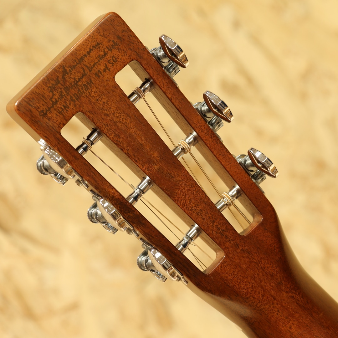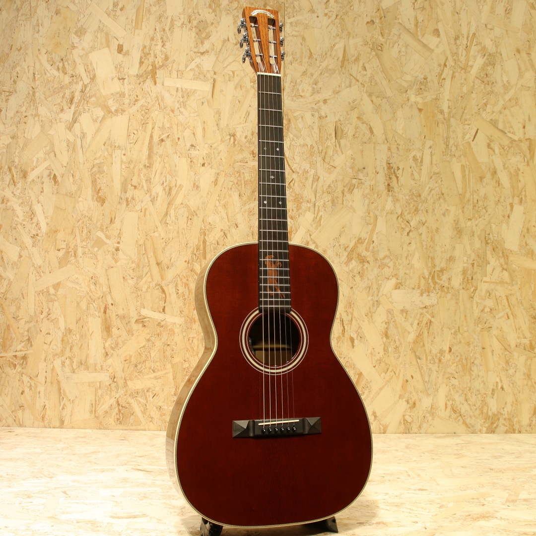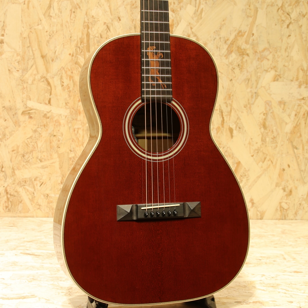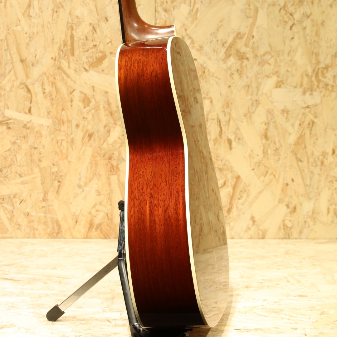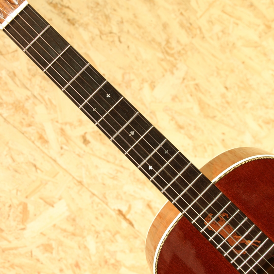 独自の工法と方法論で高品質のアコースティックギターを製作している長野県松本の老舗"ヘッドウェイ"。HEADWAYは1977年に創業、1983年には工場が2度の火災にあってしまい一度はアコースティックの製造はストップしてしまいました。2000年にはファンからの熱い要望から復活し現在まで製造を続けています。本器はヘッドウェイ創立30周年を記念して限定50本のみ製作されたオールマホガニー仕様ニューヨーカータイプ、”HN-30A/AM”。2007年製USED品です。マホガニー単板ボディ、マホガニーネック、エボニー指板&ピラミッドブリッジ、スロテッドヘッド、ゴトーペグ、ヘリンボーントリム、ジグザクバックストリップ、ウッドホースインレイ。当時HEADWAY創立30周年モデルは複数存在しており、本器はそのうちの1機種でした。スロテッドヘッド、ピラミッドブリッジ、12Fジョイントと古き良き20sマーチンを意識したであろうニューヨーカースタイル。Style18では本来見られませんが、アレンジを施し28のようなジグザクバックストリップとヘリンボーン、ダイアモンドスクエア指板インレイをさりげなく配置。ジョイントフレットから指板エンドにかけては馬が駆け抜ける様を象った木の彫刻。ヘッド裏には30周年を記念した手彫りの刻印が施されたコレクティブな仕様。オールマホガニー単板仕様で製作した通な1本と言えるでしょう。マホガニーらしく甘さや切れ味、明朗とした響きを持ち味とする個体。マホガニーはトップ材の中では硬い部類に入る材の為、ブライトでクリアな響きを生み出してくれます。このブライトなトーンによって、弾けるようなパーカッシブなプレイを弾きたくなる独特の響き。芯が強く輪郭がはっきりとしたトーンはヘッドウェイ特有、マホガニーのクリアさと合わさって澄んだ音色を奏でてくれるギター。柔らかく弾けばメロウにややダークなトーンに、強く弾けばハキハキとした快活さを。強弱による表情の違いを楽しめる1本です。後付けにてL.R.Baggs社製HiFiが搭載。コンタクトピエゾタイプでトップの振動を拾いつつしっかりと弦の芯音も出力する優れものです。アコースティックな柔らかい雰囲気からややソリッドでバンド等でも埋もれずに使用できるラインサウンドまで多彩な活躍が期待できます。6弦側ヘッド先端の角に僅か当てキズによる塗装欠けが見られますが、その他にはボディ表面上の薄い弾きキズや薄いバックルキズ、薄い擦りキズ程とキレイなコンディションをキープされている本器。ネックコンディションも良し、演奏性良好な1本です。周年を彩るために製作された限定モデル、細やかな装飾から気合の入れようが窺えるギター。ニューヨーカーサイズで持ち運びもしやすく、ルームギターとしても気軽に弾ける1本です。お手元で是非ご堪能下さいませ。オリジナルセミハードケースが付属します。