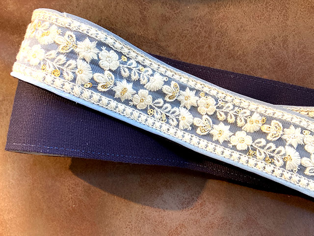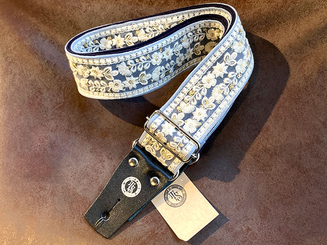 刺繍されたレース生地が美しいギターストラップです。刺繍レースの裏にはアクリルテープを縫い付けてありますので、強度もバッチリ。