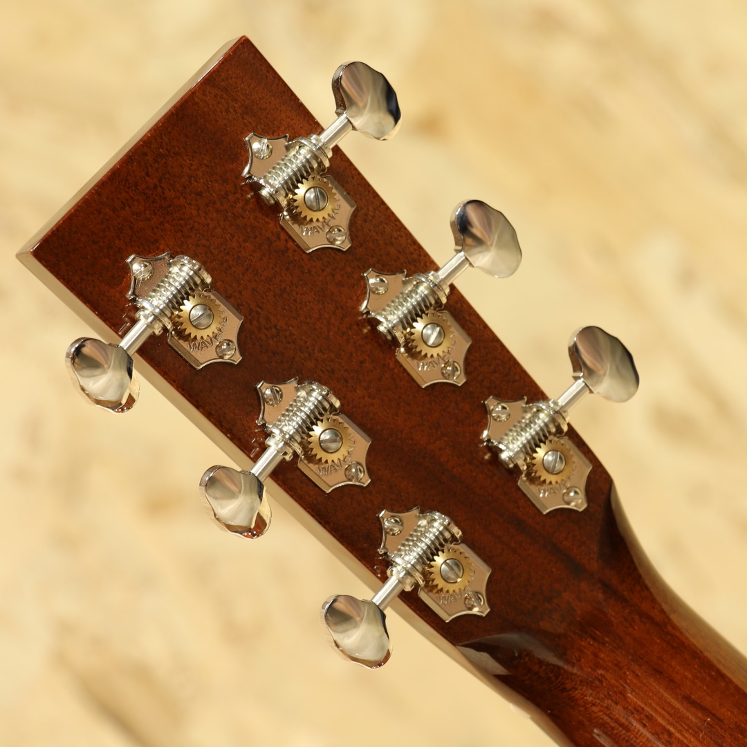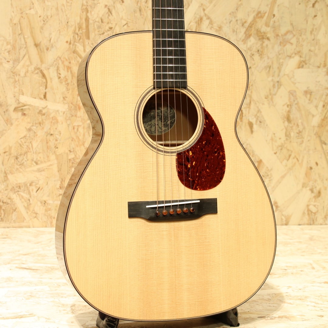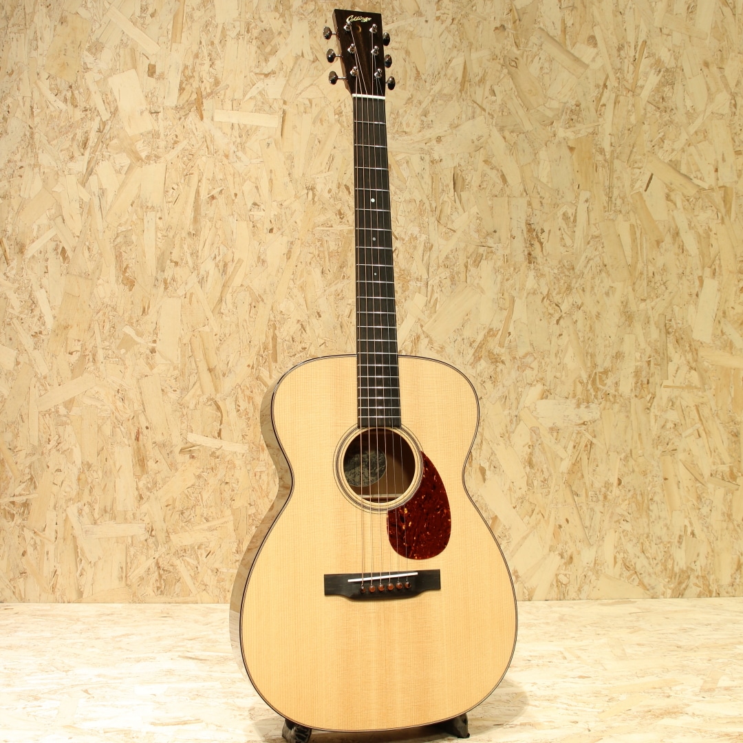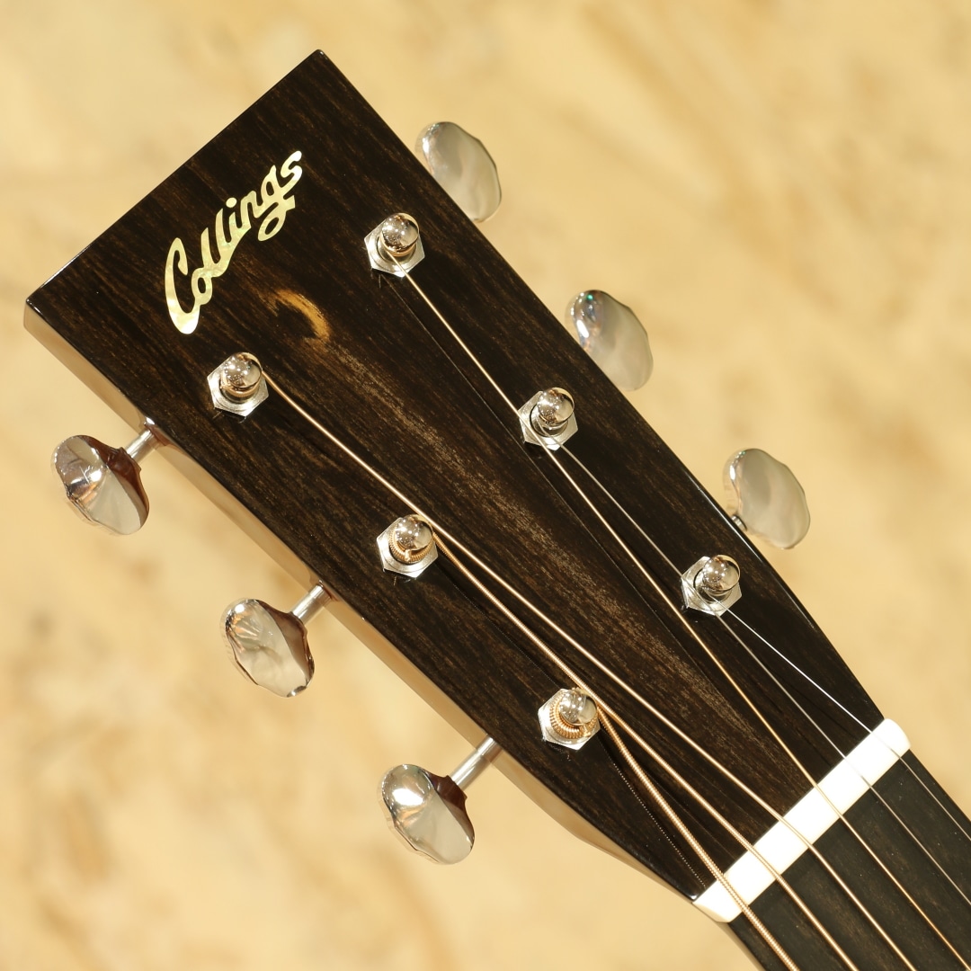 世界的にもっとも高い評価を得ているブランドの一つであるコリングスギターの新しいアイデアとしてリリースされたラインナップ"トラディショナル「T」シリーズ"。ビルのルーツに遡りコリングス・サウンドに更なるトーンバリエーションが加わったモデルとなっていて、1930年代のビンテージギターの特徴でもある強力な基音のレスポンスを備えたギターに仕上がっています。本器はOOサイズ、スタイル18を基にした"OO1T 14Fret”。シトカスプルーストップ、ホンジュラスマホガニーサイド&バック、ホンデュラスマホガニーネック、エボニー指板&ブリッジ、ウェバリーペグ、ナット幅42.9mm、MOPドット指板ポジション、べっ甲柄セルロイドピックガード、べっ甲柄バインディング、スキャロップドXブレイシング。組み込みには動物性接着剤を使用し、極薄のニトロセルロースラッカーフィニッシュが用いられたこだわりの造り。これがしっかりとした基音やレスポンスを生み出しています。ぱっと見や抱えた感覚ではわかりませんが、ボディのウエスト部をはじめ一般的なOOサイズよりもやや横幅が広く、繊細なタッチの差や見た目以上のボリュームを出すのにも理想的なサイズ感にて設計。ハッキリとした輪郭で、つやつやとした一音一音の粒立ち。余分な倍音に頼らないほど線の太い実音ですが、音と音とには確かな間隔があり、サウンドに立体感を覚えます。強弱タッチがそのままに飛び出る表現力の高さにも驚きますが、ハイポジションに至るまでコシと粘りのあるサスティーンも流石コリングス。高音域の抜けがフィーチャーされがちな小ぶりシェイプですが、豊かな中音域とサイズを超えたボリューム感が気持ちよく、OOでも充分かもと感じさせてくれます。ショートスケールながら絶妙なテンション感を持っているので、ピックストロークでもフィンガーピックでも幅広いスタイルに対応できる高ポテンシャル。ストロークからフィンガースタイルまでオールラウンドに対応できる演奏性を持った1本です。量産メーカーとは生産スタイルも一線を画すスタイルを貫くコリングスならではのハイクオリティな逸品。ぜひそのお手元でご体感ください。