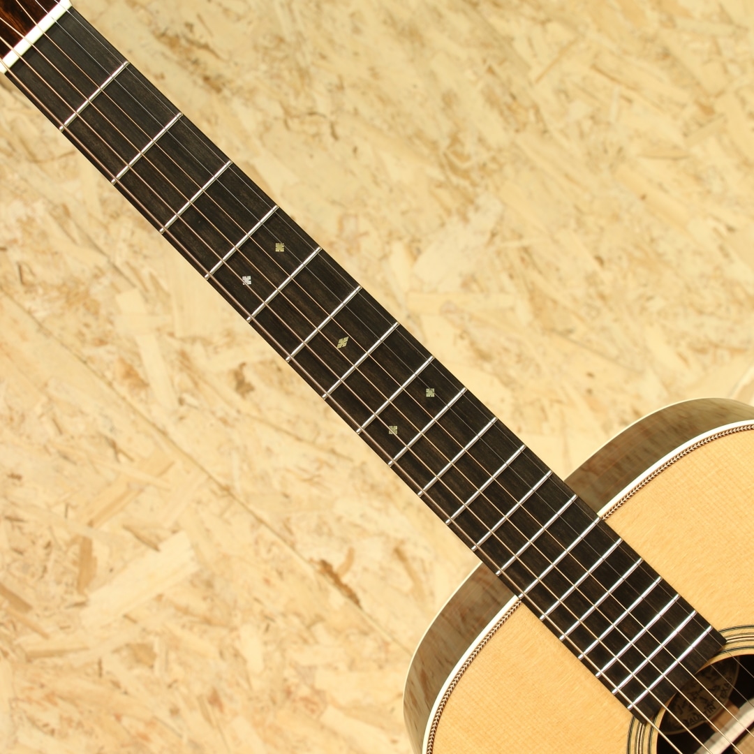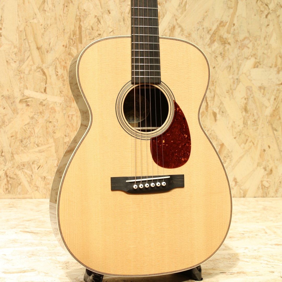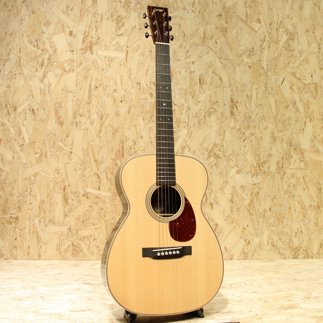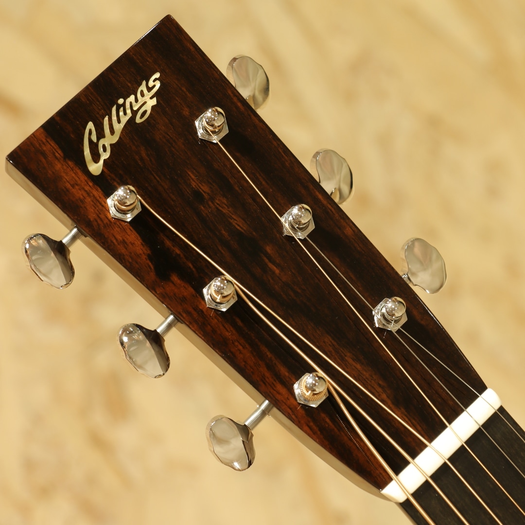世界的にもっとも高い評価を得ているブランドの一つであるコリングスギターの新しいアイデアとしてリリースされたラインナップ"トラディショナル「T」シリーズ"。ビルのルーツに遡りコリングス・サウンドに更なるトーンバリエーションが加わったモデルとなっていて、1930年代のビンテージギターの特徴でもある強力な基音のレスポンスを備えたギターに仕上がっています。本器は、トラディショナルシリーズ00 14Fretの”OO2H Traditional 14Fret”。美しい杢のシトカスプルーストップ、イーストインディアンローズウッドサイド&バック、ホンデュラスマホガニーネック、エボニー指板&ブリッジ、ウェバリーペグ、ショートパターンスクエア&ダイアモンド指板インレイ、べっ甲柄ピックガード、ヘリンボーントリム、プリウォースキャロップドXブレイシング。トップブレイス構造はこのシリーズのためにカスタムされた戦前スタイルのスキャロップド・Xブレイシングとなっているほか、動物性接着剤を使用し、極薄のニトロセルロースラッカーフィニッシュが用いられるこだわりの造り。一般的なOOサイズよりもウェスト部の横幅がやや広く、繊細なタッチの差や見た目以上のボリューム感を獲得。14フレットによりハイポジションでの演奏性も良く、多種多様なプレイスタイルにも対応できるポテンシャルを持っています。コリングスならではの仕上げの美しさは愛でるだけでも惚れ惚れする1本ですが、一度音を出せばその完成度の高さに虜となるでしょう。小振りであることを忘れてしまう様な音量で、バランスの取れた上質なトーン。楽器全体が響く感じは、プレイヤーに絶大なる一体感を与えてくれます。ショートスケールでありつつもハッキリとした音像を持ち、ハイフレットまでしっかりと立ち上がるサウンドでフィンガースタイルからピックでのストロークまで広いプレイスタイルを可能にするポテンシャルの高さを持っています。楽器自体の重量も比較的軽く、近年の新品ギターを抱えた感じを覚えにくい不思議な感覚に襲われます。ネックはVintage Now Neckをベースとしてわずかに細く、フィンガーボードの角を丸めた新たなトラディショナルシェイプを採用しており、新品にありがちな握りこんだ際のストレスも少ない仕様。ヴィンテージを意識したゴールドパールの指板インレイやスモール・ブラウン・ヘリンボーントリム、絶妙なエイジングトナーのトップがこのギターの質感を高めています。ブルーグラッサーを筆頭に多くのファンを魅了し、量産メーカーとは生産スタイルも一線を画すスタイルを貫くコリングならではのハイクオリティな1本。その完成度の高さをぜひお手元でご体感ください。